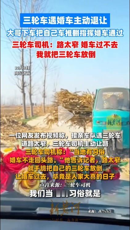为山东济南这位大哥点赞!为了在狭窄的乡村小路上给婚车让路,自己不仅主动把自己的三轮车推到地里,还推翻了给婚车留出足够空间。从这条小路来看,双方家离得应该都不远,都是乡里乡亲明白婚车不能倒车的风俗。三轮车上拉的玉米杆,横起来比较长,基本上会占满车道,如果不让婚车肯定过不去。婚车赶紧下来给大哥红包,不管数额多少都是沾沾喜气。双方做得都非常到位!