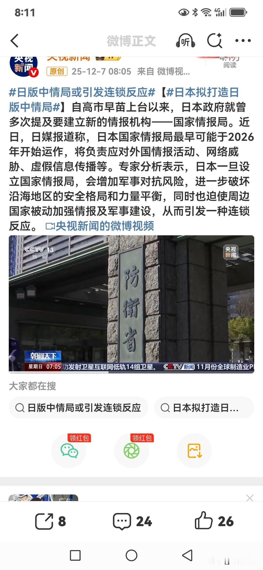 日本高市政府要搞事情了,被曝最早2026年成立“国家情报局”,摆明了是想打造日版“中情局”。高市早苗一直主张提升日本情报能力,竞选时就提过这构想,联合执政的日本维新会也支持,还写进了政策纲领。 说是仿效美国中情局塑造“安保强人”形象,可负面影响也不少。日本防卫费用本就在持续攀升,多个行业都承压了,有经济学者说这才是日本真正的“存亡危机事态”。而且一旦成立,这新机构权力不小,直接向首相官邸汇报,说不定会引发一系列连锁反应,真不知道日本这步棋会把自己带向何方。 高日早苗 日本对华情报战