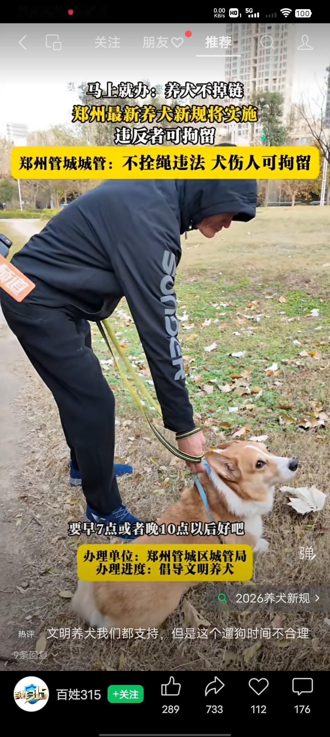 郑州开始实施养犬新规定,马上就办:养狗不掉链。只要实施到位就好。 郑州管城城管:从2026年元月一日开始,养狗新规开始实施,有一个特定的仪器一扫狗的证件,就会显示狗狗的所有信息,打疫苗的时间都会显示。新的养犬条例以及新的治安法,如果遛狗不拴绳就属于违法行为,然后如果有咬人的情况下就可以拘留。再者就是遛狗的时间,要在早上七点之前晚上十点之后,要避免人多的时候影响到别人。还有就是遛狗人,也要把狗的粪便一并处理掉。 我觉得这个规定很好,避免小区的卫生脏乱差,遛狗不拴绳以免吓到孩子,还有小区里好评,有许多老人在散步老人的腿脚本来就不方便, 遛狗不拴绳,很容易撞到老人,一旦把老人撞倒有很大危险。希望养狗新规,其他的地方也早日实施到位。