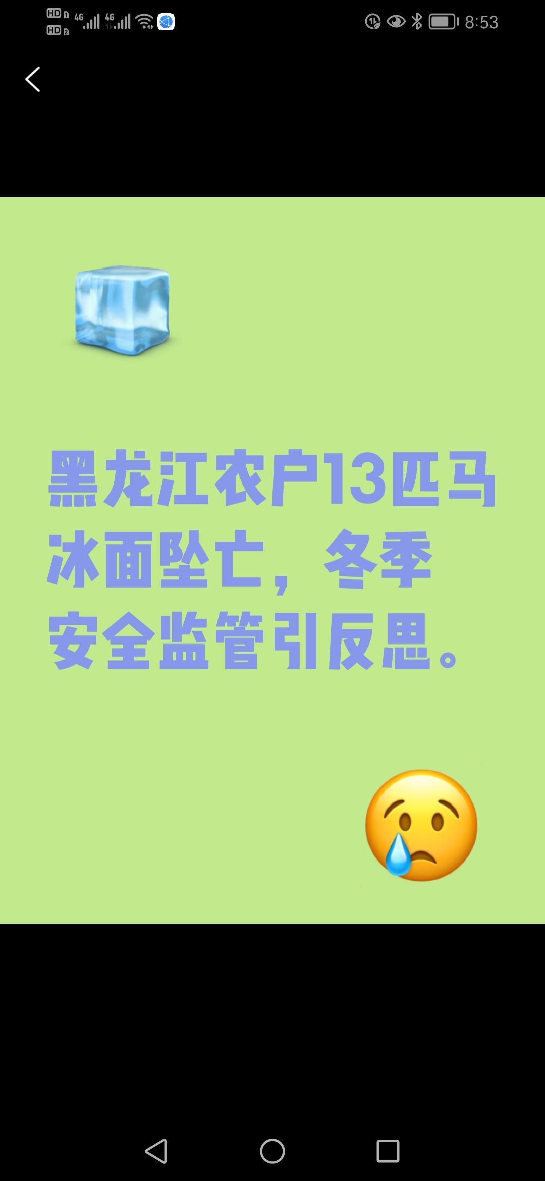 黑龙江一水库冰面下惊现13匹被冻死的马,这究竟是怎样的一个悲剧呢? 近日,黑龙江黑河嫩江市七星泡农场发生了一起令人痛心的悲剧。12月5日,农户王先生养殖的13匹马,在冰面破裂后不幸溺水身亡,随后被低温冻在冰层中。据目击者描述,当天马匹因口渴扎堆到水库冰面喝水,不料冰面突然碎裂,马匹纷纷坠入冰冷的水中。由于气温骤降至零下二三十摄氏度,马匹在水中迅速冻死。两天后,王先生才发现此事,尽管他全力打捞,但为时已晚。王先生已七十多岁,家庭收入全靠养马,这次损失高达三十多万元,对他来说无疑是沉重的打击。这起事件不仅让人感叹自然的威力,更引发了我们对冬季安全监管的深刻反思。当地社区和相关部门迅速行动,协助处理善后,并希望借此机会加强农村养殖安全,防止类似悲剧再次发生。 这起悲剧令人痛心,也给我们敲响了警钟,冬季安全监管不容忽视。希望大家能关注农村养殖安全,共同为减少类似悲剧的发生出一份力。快来评论区留下你的看法吧!松花江冰面事故