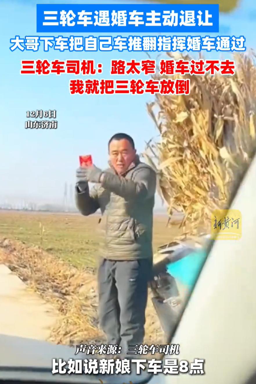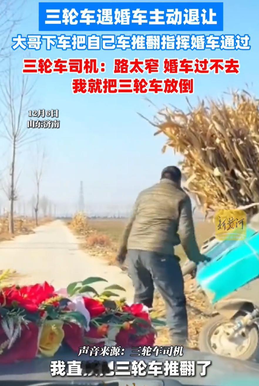 “这就是讲究!”山东济南,一对新人结婚,新郎在接亲时一辆三轮车迎面而来堵住去路,不过让人意外的是,三轮车司机为了让行做到了极致,直接把三轮车给放倒,让出唯一一条小路给车队,这下把新郎都弄得不好意思了 视频显示,路是那种典型的乡村道,窄得很,只够一辆轿车慢慢挪。正走着呢,前面来了辆三轮车,车上还堆着些杂物。这下可好,路被堵住了,两边谁都过不去 开三轮的是个中年大哥,他往后倒了几步,发现还是让不开,路实在太窄,边上又是土沟,没地方腾挪。婚车不能退,按老规矩,接亲的车不走回头路 眼看着要僵在那儿,三轮车大哥突然下车,二话没说,两手扶住车把,一使劲,直接把三轮车推倒在路边沟坡上。车上的东西也没散,就是斜斜靠着,让出了一条细细的通道 新郎坐在头车里,本来还挺着急,一看这情景,赶紧下车跑过去,一边道谢一边往大哥手里塞红包。大哥摆摆手,笑得有点憨,说大喜的日子,不能耽误你们正事 有一条高赞评论是这么说的:车能放倒,路能让开,心能放宽——人间最好的体面,从来不是争道,是成人之美。 原来最通透的智慧,是把方便留给别人,把温暖留给人间 确实如此,这事不大,却特别见人情。如今路上车多,抢道、互不相让的常见,但总有一些人,愿意用最笨拙也最实在的方式,成全别人的好事。三轮车一倒,倒出的是通道,也是乡里乡亲那种朴素感情 农村的道,不宽;人的心,却挺宽。三轮车师傅那一下没有多想,只是觉得自己能让就让,能帮就帮。等婚车过去,他把车再扶起来继续干活,生活接着走,没啥故事性,却特别真实