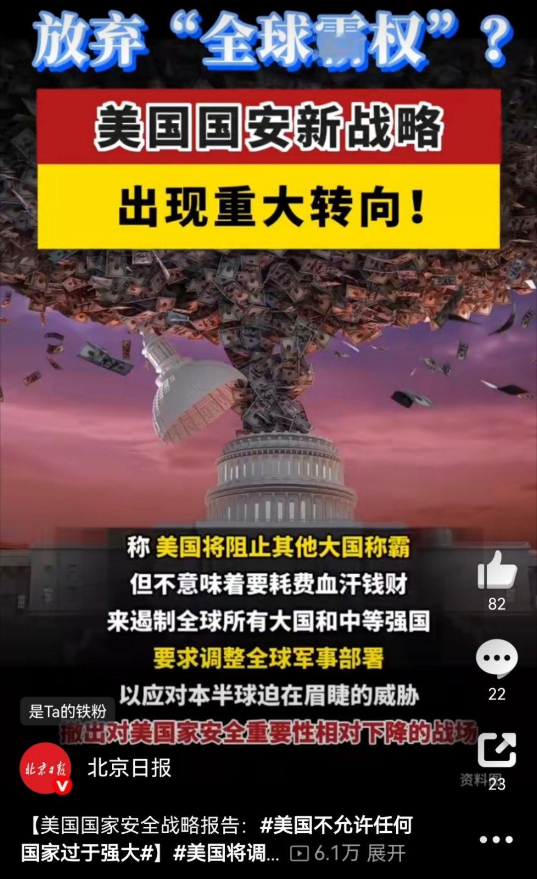 霸权重构的焦虑:美国新战略背后的逻辑陷阱美国新版国家安全战略报告,本质是一份霸权衰退期的“自救指南”——以“西半球优先”重构地缘支点,以军事收缩减负,以单边逻辑定义安全,看似布局精妙,实则深陷多重自相矛盾的逻辑陷阱,暴露其既想维系全球霸权又力不从心的深层焦虑。报告抛出“特朗普推论”,将“门罗主义”升级为对拉美的全面干预纲领,从军事部署到经济捆绑,从打击贩毒到遏制“外国势力”,实质是把拉美当作霸权衰退后的“战略后花园”,试图通过控制西半球关键资源与通道,弥补其在全球其他地区的影响力流失。但这种“排他性控制”早已违背拉美国家的主权诉求,美委局势的持续紧张的,恰恰证明霸权干预只会引发更强反弹,所谓“西半球安全”不过是美国私利的遮羞布。全球军事存在的调整,更是充满功利主义的算计。要求盟友“停止搭便车”、淡化恐怖主义威胁、试图从乌克兰危机抽身,表面是“减轻安全负担”,实则是无力支撑全球霸权的无奈收缩。一边指责欧洲阻挠结束乌克兰危机、质疑跨大西洋同盟可靠性,一边又想“重建与俄罗斯的战略稳定”,这种前后矛盾的表述,暴露其既想摆脱欧洲拖累,又怕俄罗斯趁机扩大影响的两难;而“不允许任何国家过于强大”的赤裸裸宣言,更是将霸权逻辑推向极致——它所谓的“战略稳定”,不过是“美国主导下的强弱秩序”,一旦打破这种失衡,便被视为对其核心利益的威胁。经济安全与“再工业化”的论述,看似切中美国产业空心化的痛点,实则仍是霸权思维的延伸。强调关键技术主导、供应链自主、能源与金融霸权,本质是想通过掌控全球产业链顶端与核心资源,构建“美国中心”的排他性经济体系,阻止其他国家在科技与产业领域实现赶超。但全球化时代的产业链深度融合,早已不是“零和博弈”所能切割,将经济合作政治化、技术交流武器化,最终只会反噬美国自身的产业生态与全球竞争力。最荒诞的是,报告一边宣扬“不干涉主义”,一边加紧对拉美政治干预;一边指责国际组织“反美”,一边拒绝承担多边责任;一边把移民、全球化当作“罪魁祸首”,一边又依赖全球资源维系霸权。这种自相矛盾的背后,是特朗普政府将“美国利益”绝对化、将国际关系丛林化的极端安全观——它不愿承担霸权成本,却想独占霸权红利;不愿接受多极化趋势,却无力阻止自身相对实力下滑。这份报告与其说是战略规划,不如说是霸权焦虑的嘶吼。它试图以“收缩式干预”“选择性合作”“强制性优势”重构全球秩序,却忽视了时代潮流早已转向多极化与公平正义。当霸权逻辑凌驾于国际规则之上,当单边算计取代多边合作,美国所谓的“国家安全”,终将成为引发全球动荡的根源,而其精心布局的战略棋局,也终将在自身的逻辑陷阱中走向失序。美国不允许任何国家过于强大美国将调整全球军事存在