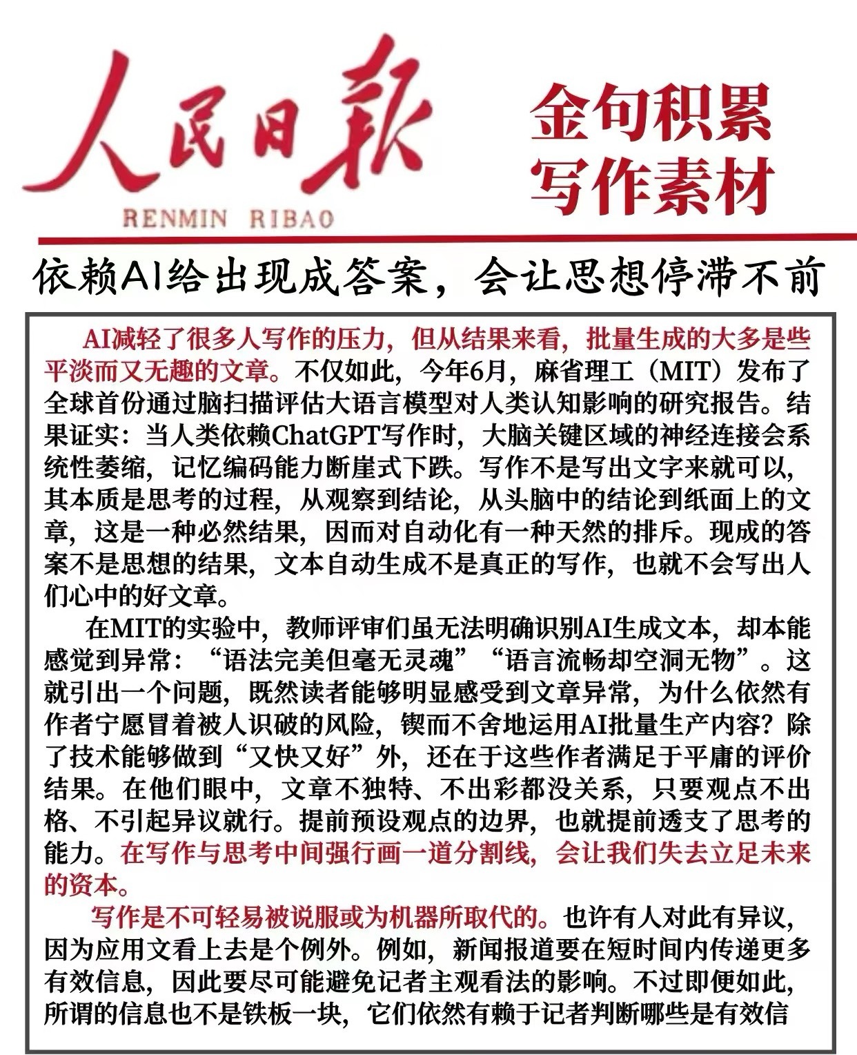 警惕20后沉迷AI警惕20后沉迷ai AI带来的3大弊端 会影响许多未成年和成年人1|思考能力退化AI可以帮你“写出来”,但写之前的思考过程如果缺失了,时间久了,人会变得只会“抄”、不会“想”。原来需要自己搭建的逻辑框架,现在直接copy,原来需要磨练的表达能力,现在一句 prompt 带过✅ 短期提高了效率,长期却拉低了你的认知深度,弱化了本人对思维模型的构建。2|创造力被平均化AI生成的内容,90%都是训练数据里的“平均水平”。如果过度依赖,你的思维、表达、甚至你的广告策略,都会慢慢变成「平庸版、模板版、无趣版」。✅ 未来能脱颖而出的人,反而是那些敢跳出模板、有独特性思维的人。个性化,独特的思维方式未来更加稀缺。3|技能点单一化,反而更容易被取代很多人以为:“我会用 ChatGPT,就能打败不会用的人。”但实际上,未来真正有竞争力的人,是懂得把AI作为加速器+放大器的人,而不是简单的工具使用者。✅ 不会独立拆解问题、不会整合逻辑的人,哪怕用再多工具,依然是低端劳动力。
