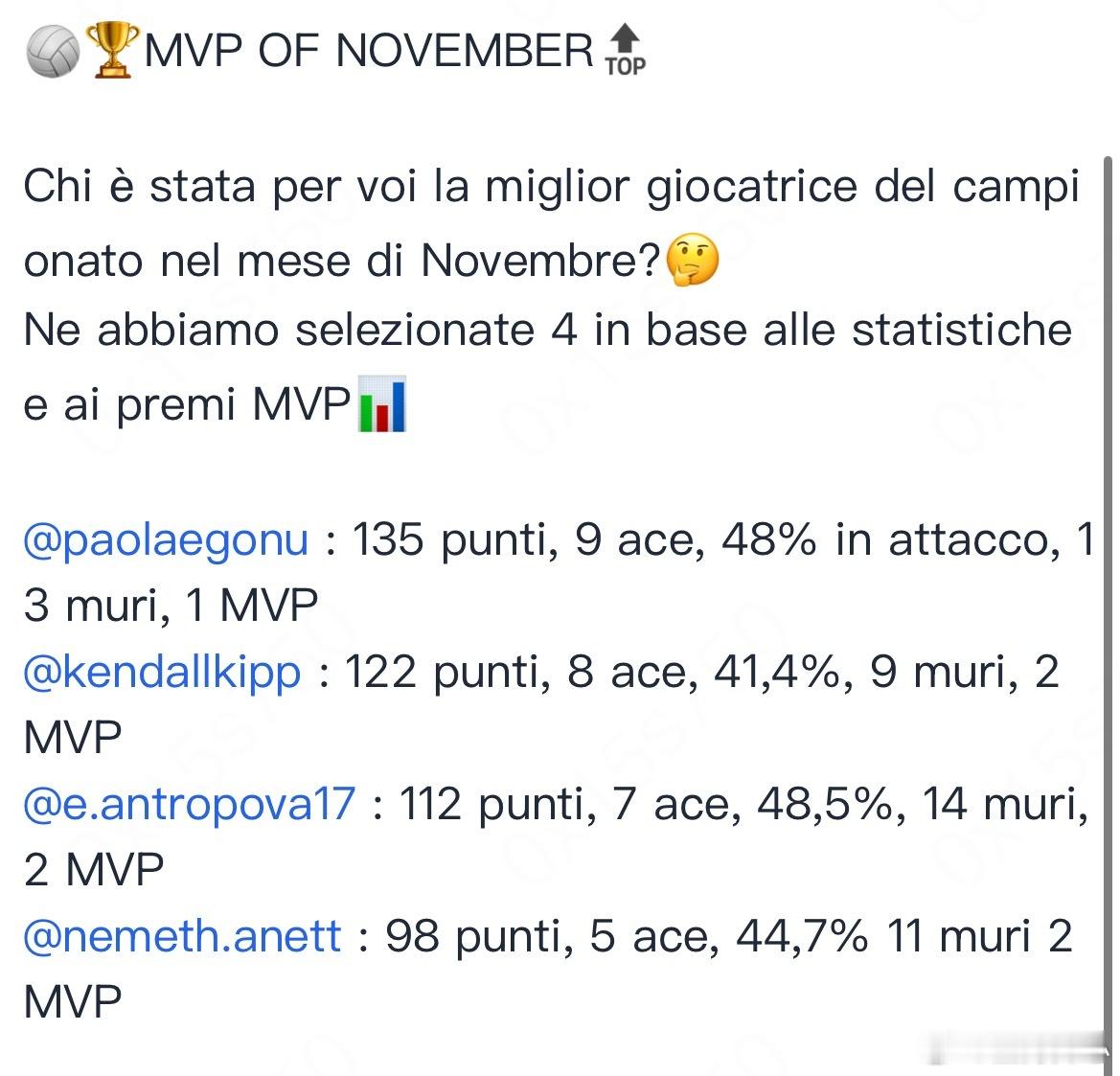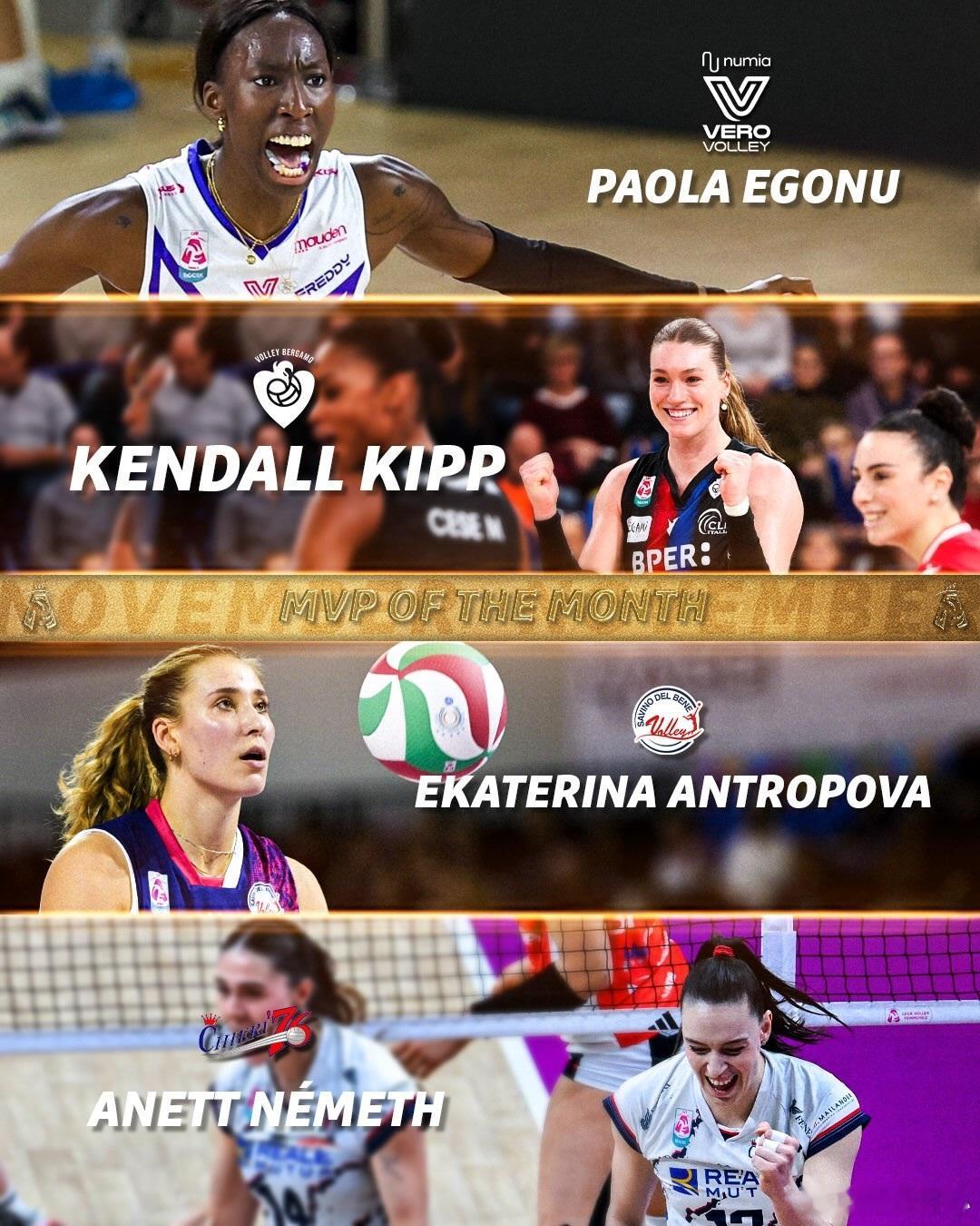 【意甲女排11月MVP候选人】四接应入选,你看好谁?艾格努(米兰)—-135分,9发,13拦,48%成功率,1次mvp;基普(贝加莫)—-122分,8发,9拦,41.4%成功率,2次MVP;安娃(斯坎迪奇)—-112分,7发14拦,48.5%成功率,2次MVP;内梅斯(基耶里),98分,5发11拦,44.7%成功率,2次MVP!你看好谁最终问鼎?世界女排新闻