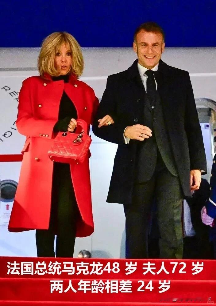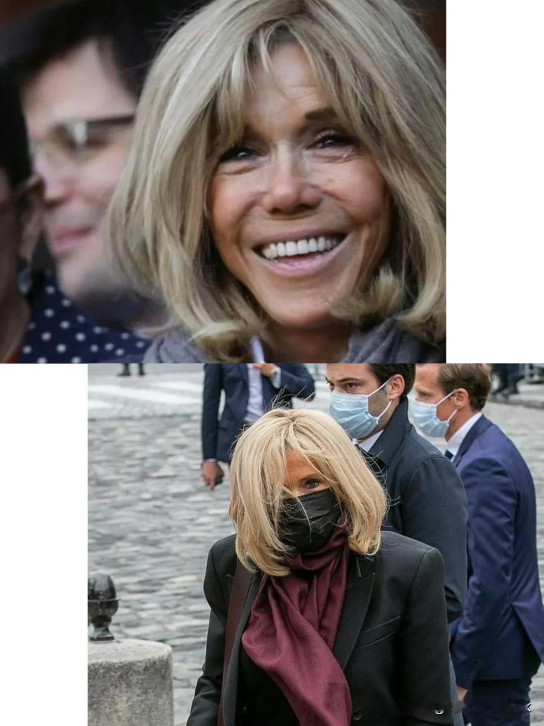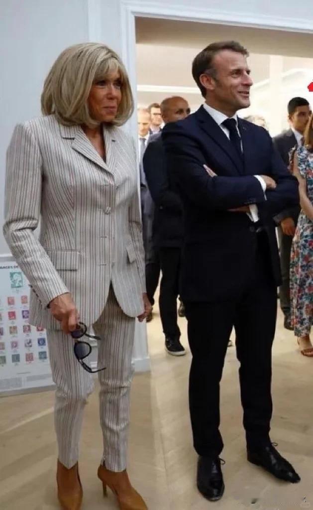 按道理马克龙应该有钱呀!怎么夫人的头发乱得像鸡窝 虽然现在夫人年纪大了,72岁了,但是出席这样重要的场合还是应该把头发收拾一下的,这样乱糟糟真的不好看也没精神 有人说她想遮住自己严重的颈纹,毕竟72岁了,老公又才49岁 我倒觉得马克龙敢29岁的时候娶54岁的她,就不在乎她年老色衰,没必要,大大方方的就挺好的 不过她虽然上了年纪了,但是身材还是保持得挺好的,大长腿加细高跟,一般人穿不好