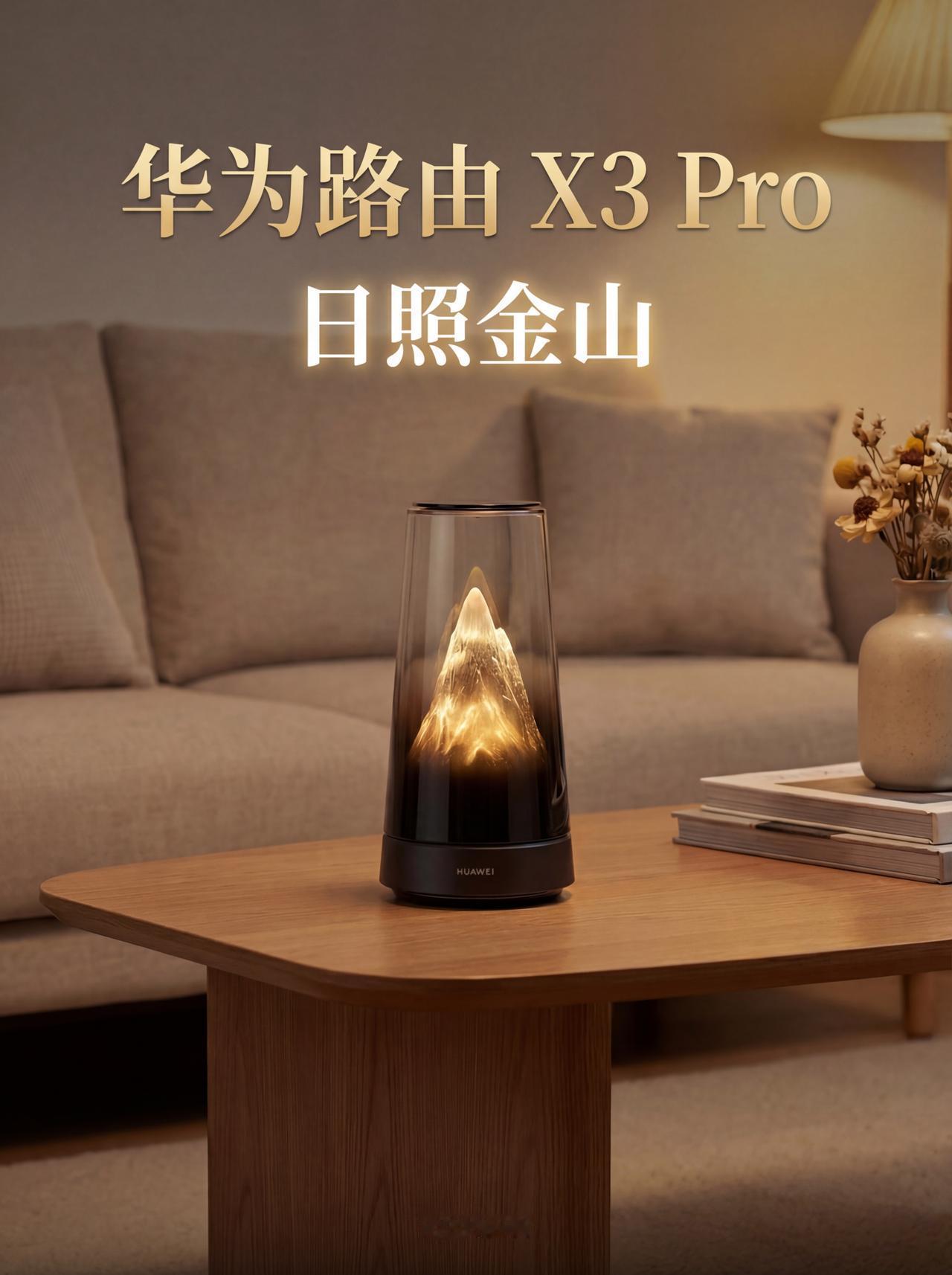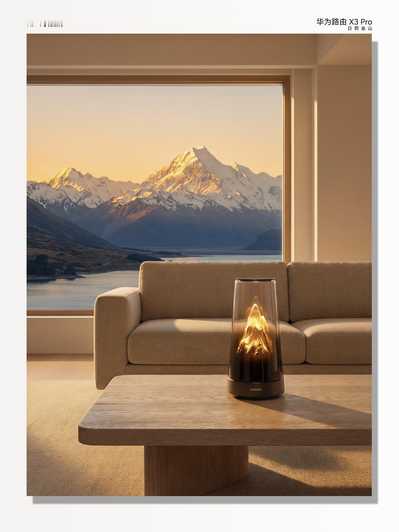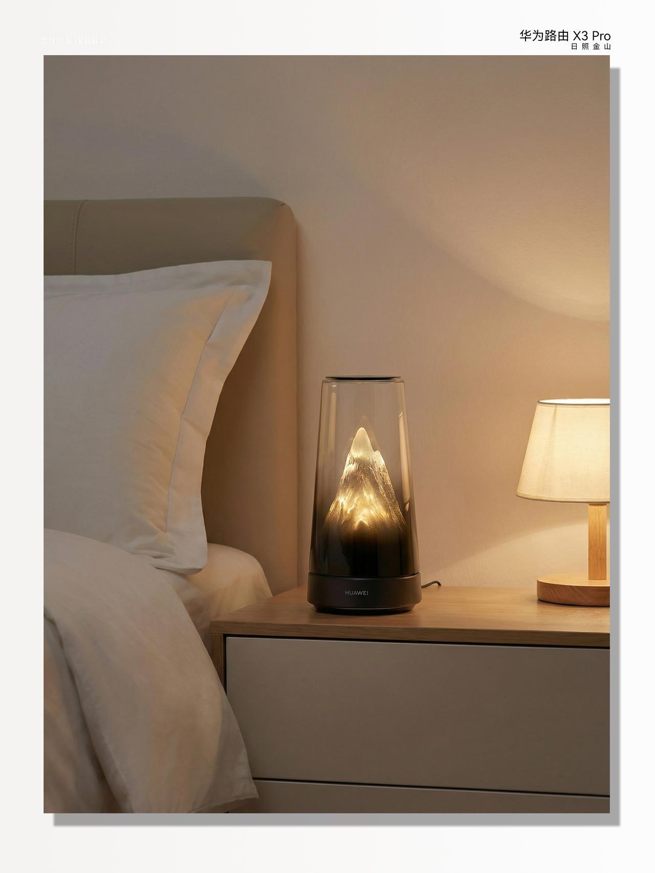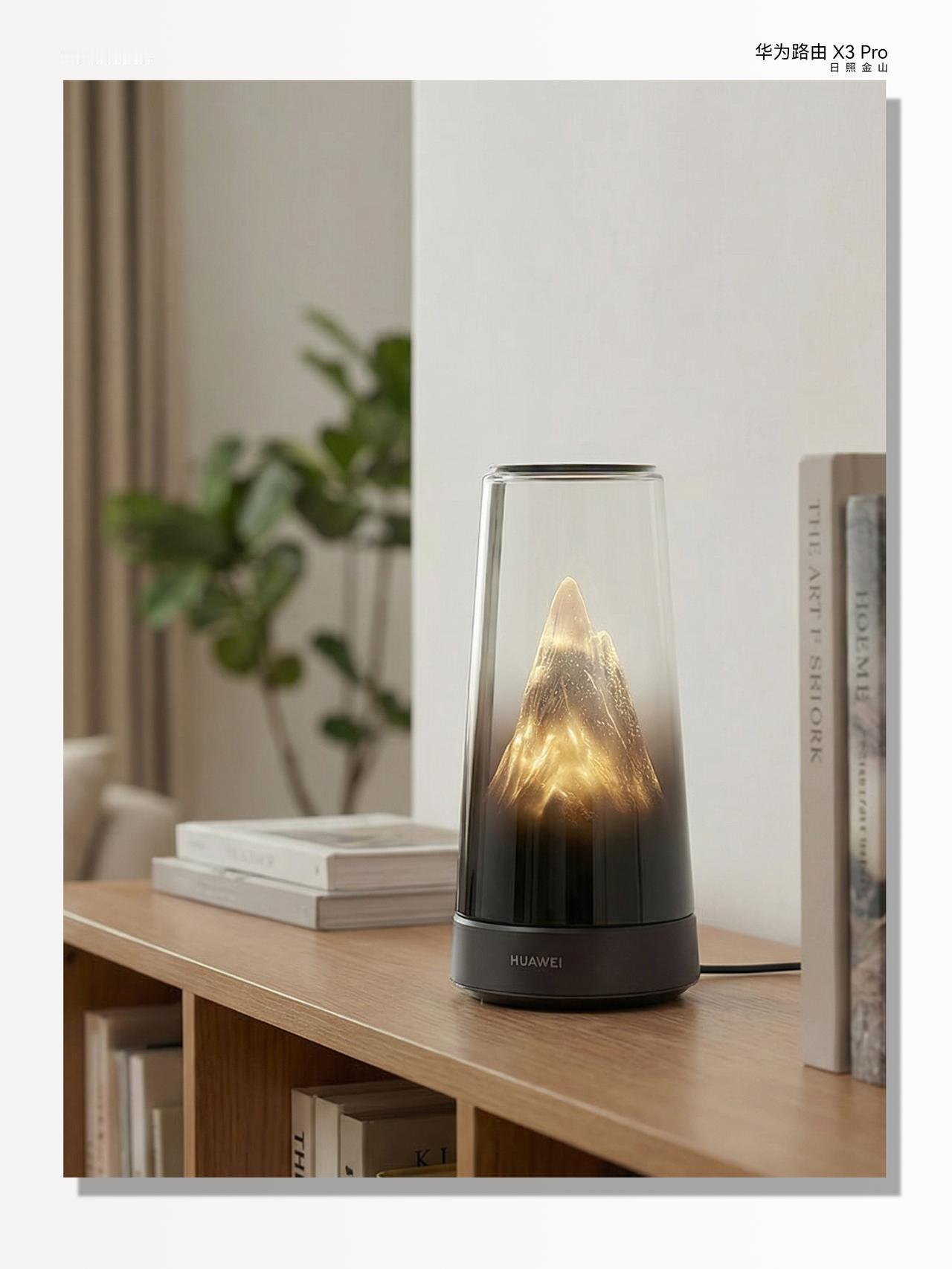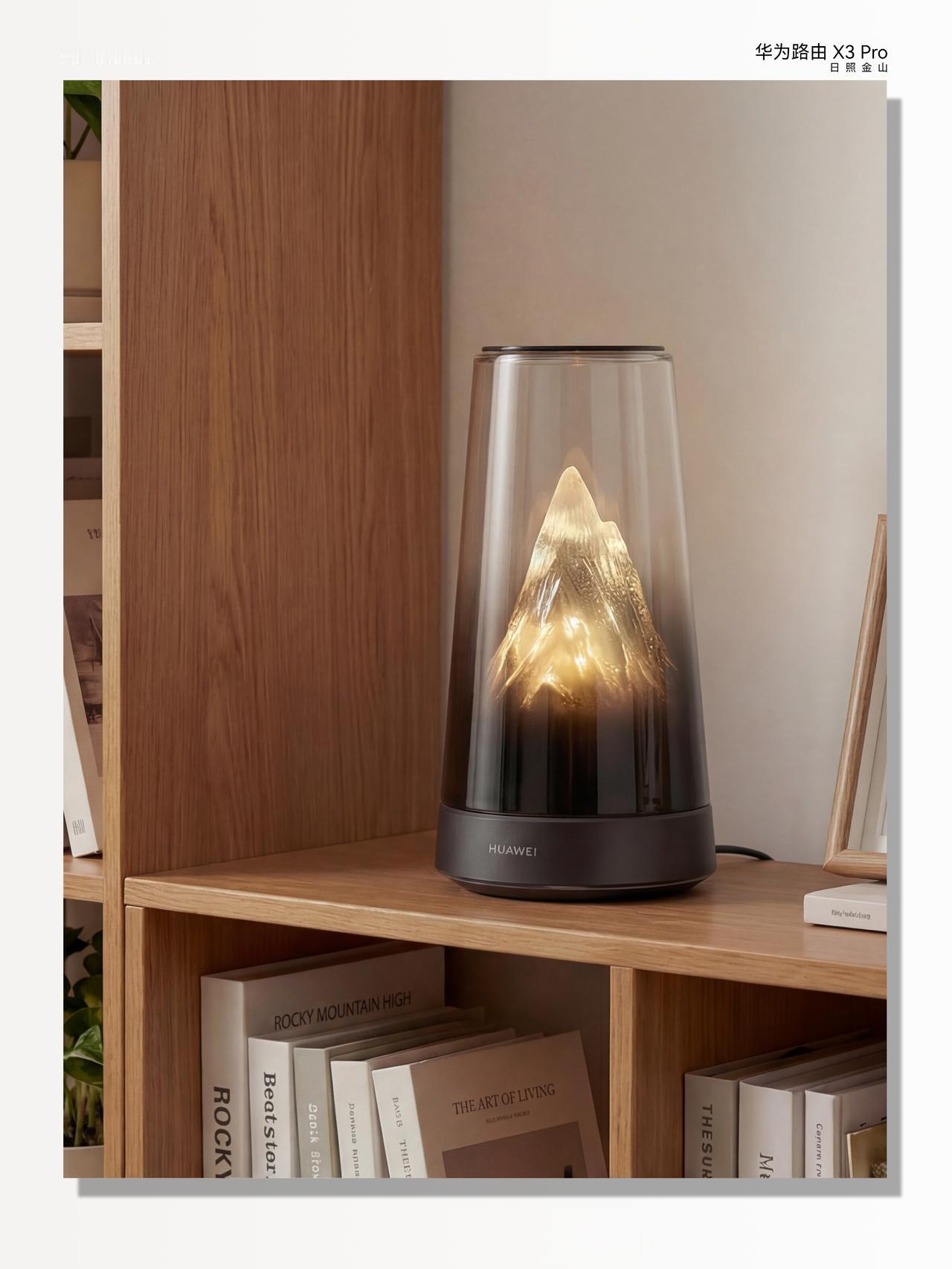 HYK图赏|华为路由器X3 Pro日照金山 圆柱形透明机身,里面内置一个了雪山模型,搭配上灯光效果,整体看起来像不像把日照金山浓缩到一个“小玻璃罐”里。雪山模型内的天线采用的是透明工艺,打开灯之后几乎就是与雪山模型融合到一起,往桌子上一摆,你能想到这是一个路由器?这外观,买来就算不用,摆在那都是一个不错的装饰品。