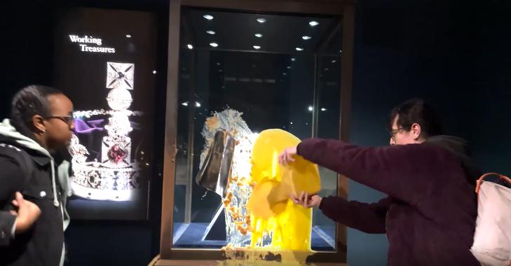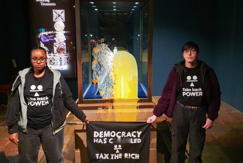 英国一个主张对超级富豪增税、名为"夺回权力"的激进组织成员,6日向伦敦塔内保护王室皇冠的玻璃展柜投掷蛋奶酱,导致这处历史遗迹暂时关闭。 据报道,该组织两名成员闯入陈列皇冠和王室珠宝的展厅,向玻璃展柜投掷苹果酥和蛋奶酱。照片中,两名稚气未脱的年轻人,拉开黑色横幅,上书"民主正在瓦解;向富人征税"。 安保人员迅速介入,官方证实王冠本身未受损坏。抗议者表示,他们将持续进行非暴力示威,直至政府采取具体行动。 事件发生后,伦敦警察厅通报称,已有四名活动人士被拘留。
