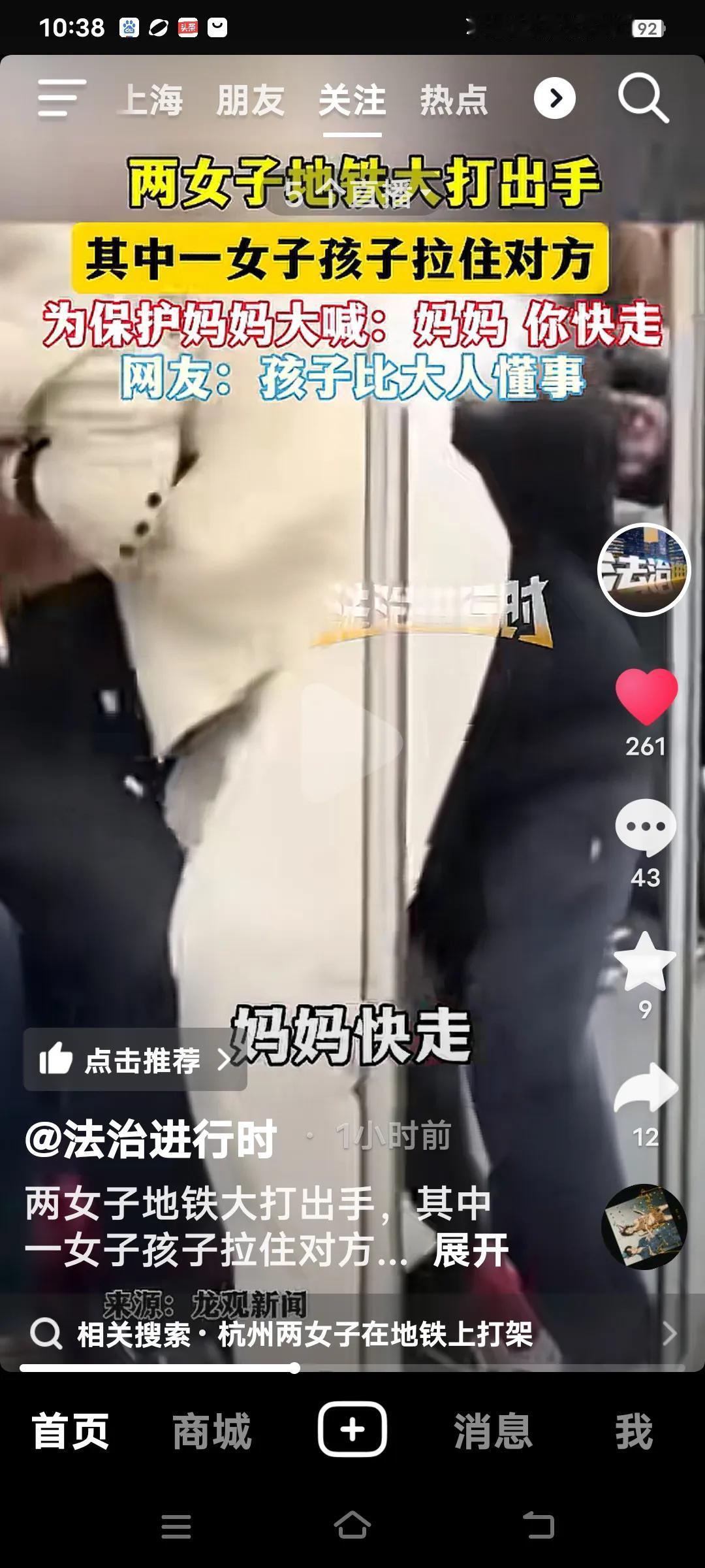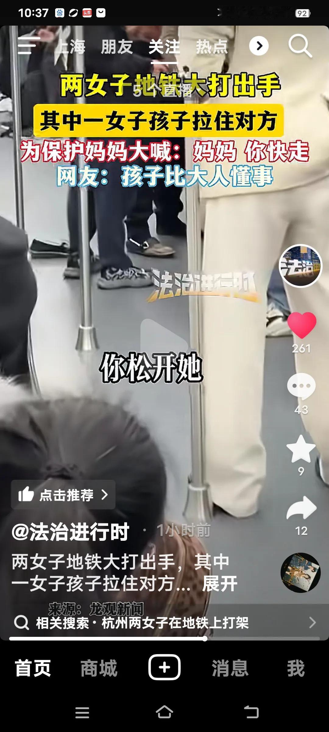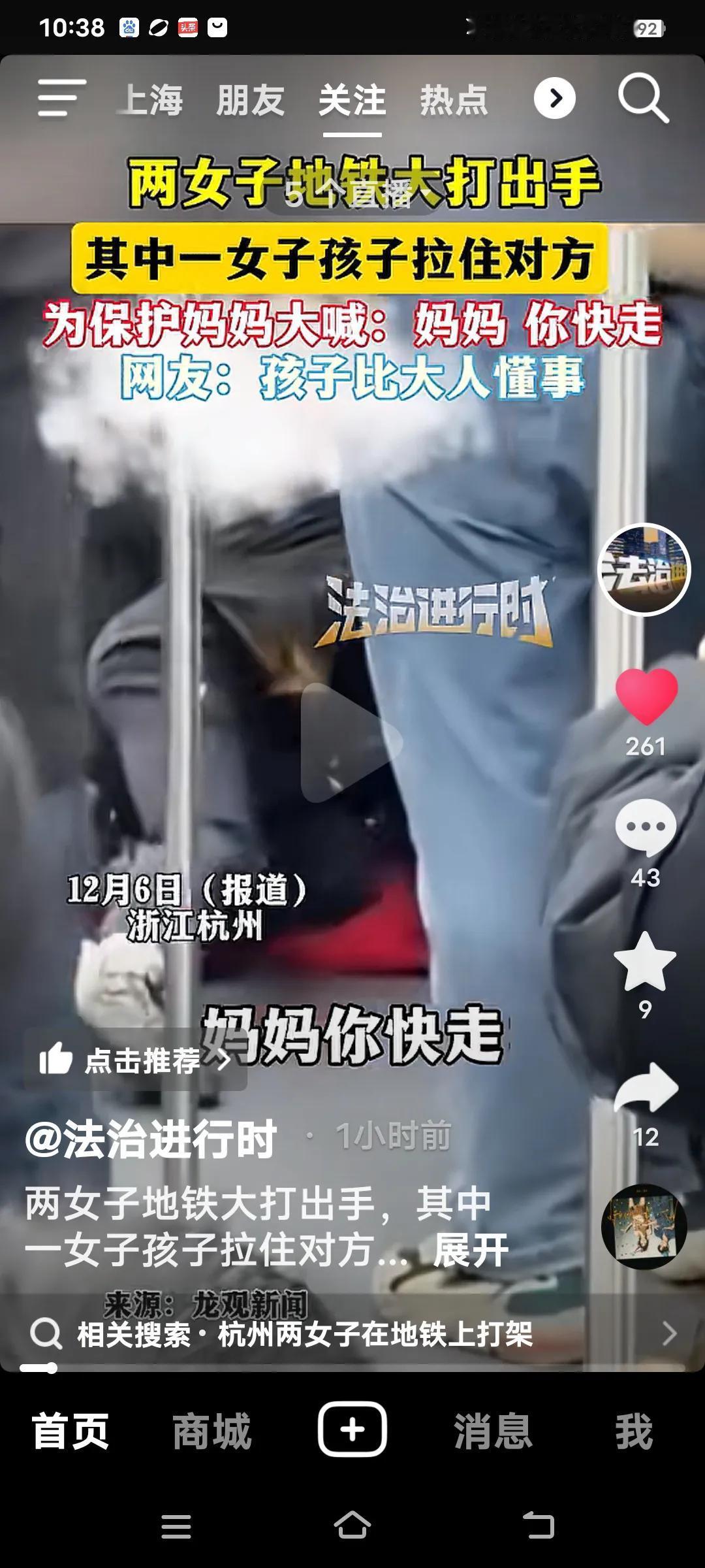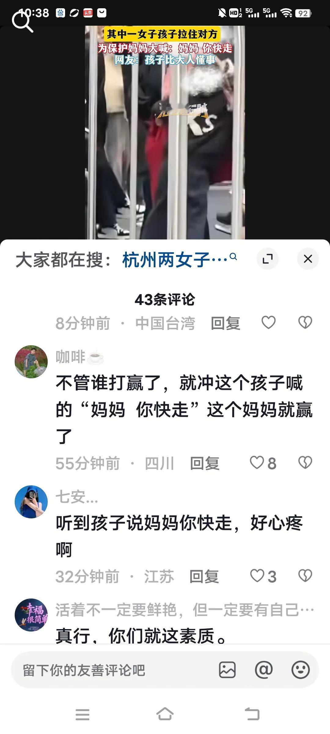 地铁上惊现惊心动魄一幕,两名女子大打出手,一旁的孩子焦急喊着“妈妈你快走”。 12月6日,在浙江杭州的地铁站,两名女子不知因何事扭打在一起。只听见孩子大声喊着“妈妈你快走”。有网友感慨,大人竟不如孩子懂事。评论区里有人说,无论谁打赢这场架,只要孩子说出“妈妈你快走”,这位妈妈就已经赢了! 但我想说,出门在外,能忍则忍。毕竟孩子就在身边,这样的场面只会让孩子受到惊吓。至于究竟是谁先动的手,我们不得而知。关键在于,事发前若有人想动手,选择退让并不丢人,一旦动手打起来,那才真的是颜面尽失,难道不是这个道理吗? 况且,俩人本就素不相识,谈不上有什么深仇大恨。为了点点滴滴大动干戈,真的值得吗?大家不妨仔细想想是不是呀!地铁车厢内吵架 大妈地铁争座