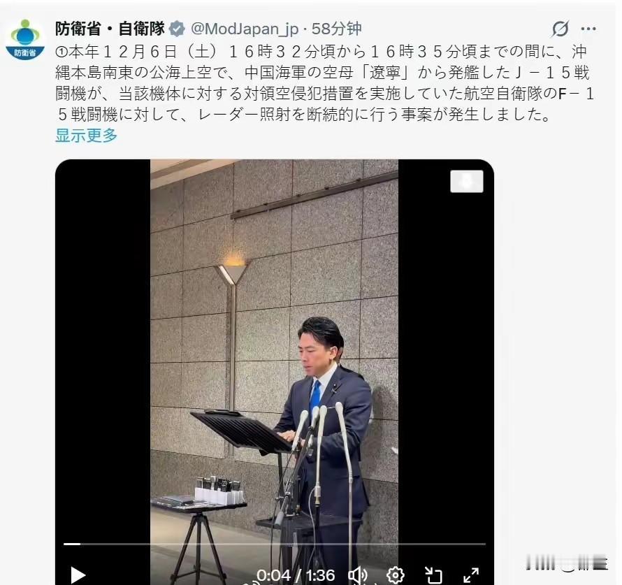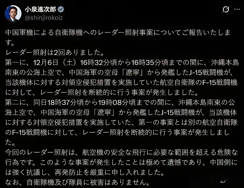 日本防卫队和小泉进次郎急了! 小泉进次郎发文强烈抗议:中国歼-15战斗机对日本航空自卫队的F-15战斗机进行了间歇性的雷达照射,该行为发生了两次,第一次是12月6日16时32分至35分之间,第二次是18时37分至19时8分之间,这事情发生于冲绳岛东南方的公海上空。 看了日本人这些天来的所作所为,只能说日本人又在搞事情了,还是把自己装成是受伤害的一方,这是日本人一贯用的伎俩。 明明是他们先挑起的事端,借用台湾生是非,现在又把自己装伤害者,这让我们不得不想起日本发动侵华战争的理由和行为,这不得不防。 都说是在公海的上空了,又不是你们日本的领土,照你是客气的了,就好像开车一样,好心提醒你们别撞车了。不领情,下次就不那么客气了。