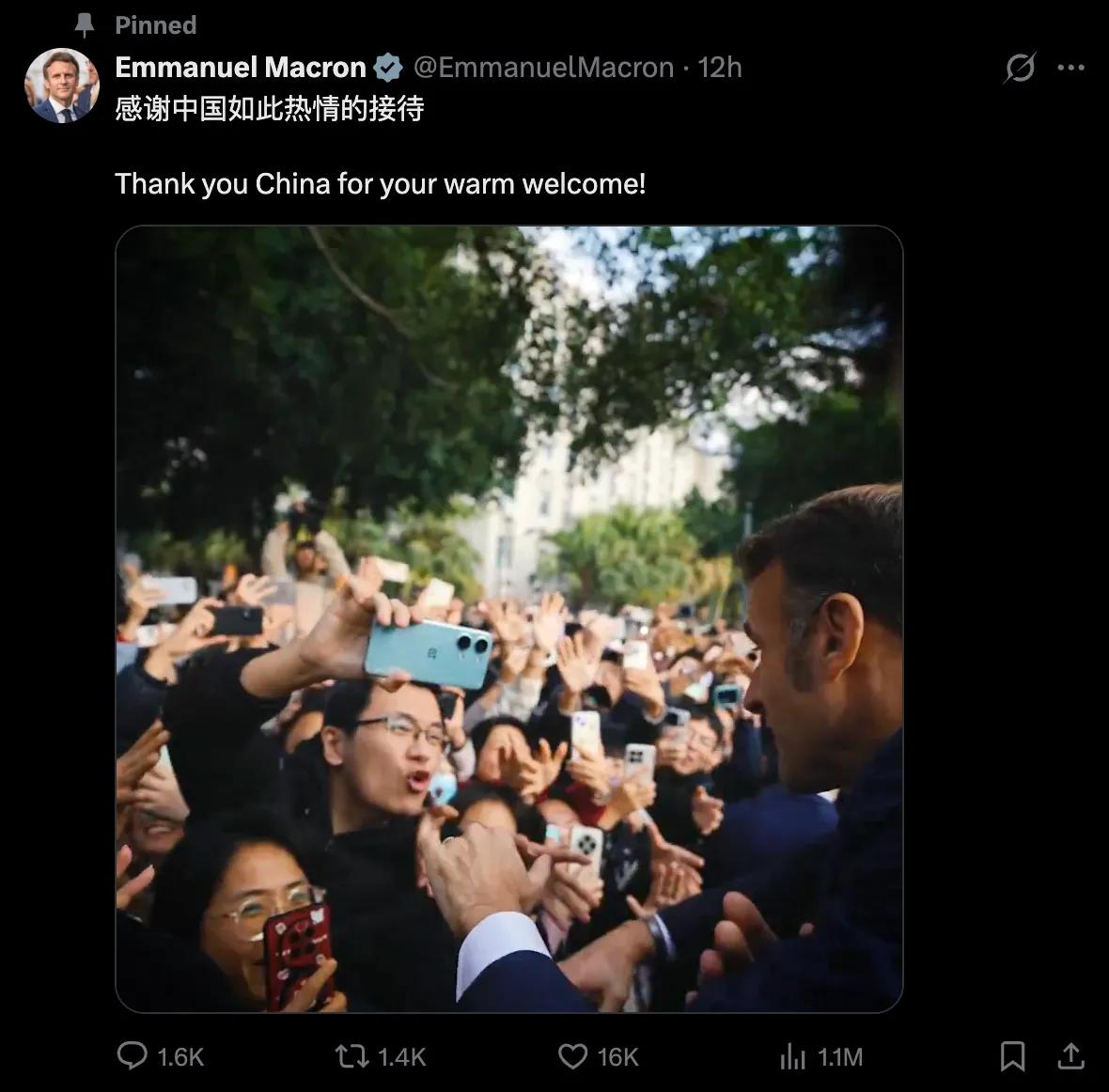 12月6日(法国当地时间)马克龙发访华集锦视频并用中文答谢中国:感谢中国如此热情的接待! 法国总统马克龙12月6日在社交媒体发布访华集锦视频,最突出的画面有两个:一个是在四川大学受到同学们的热烈欢迎,并和大学们亲热互动。另一个是他和中国乒乓球运动员孙颖莎、王楚钦和林诗栋进行乒乓交流的画面。值得一提的是,马克龙和孙颖莎互动时,直呼Shasha,点名要和她打球,赞扬她球打得好;和王楚钦互动时,王楚钦“中国乒乓功夫式”的幽默发球,不仅逗得在场的人捧腹大笑,更是逗得马克龙忍俊不禁,笑得转过身来。 中国年轻人朝气蓬勃的精神风貌,给此次访华的法国总统马克龙留下了深刻美好的印象,他不无感叹地说,时间太过短暂,意犹未尽! 消息来源:长安街知事及网络。