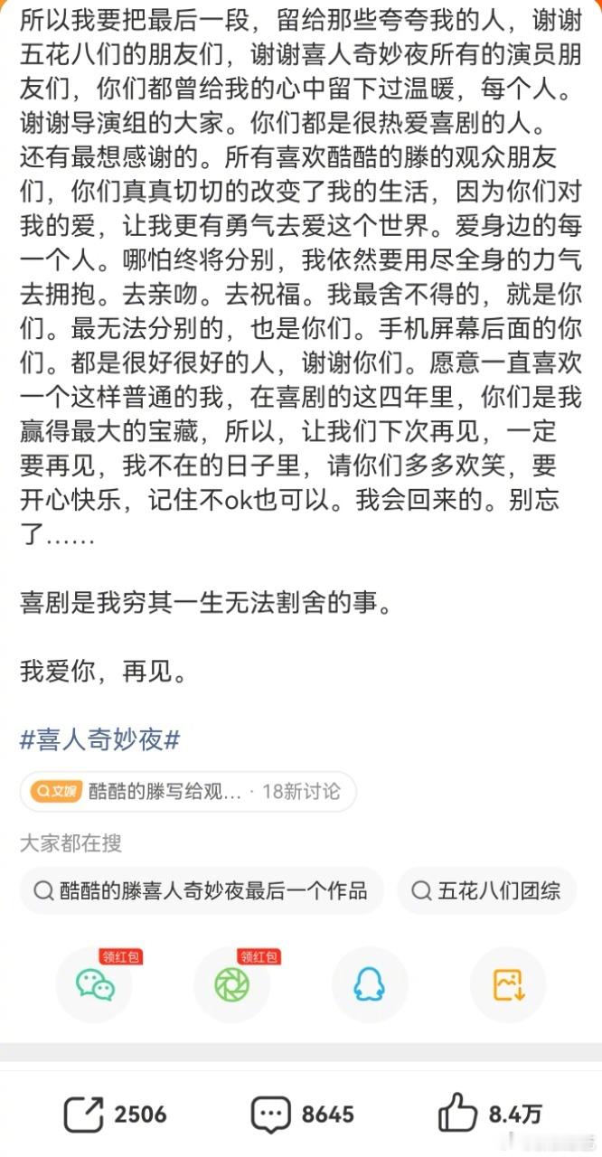 酷酷的滕写给观众的信喜人奇妙夜 酷滕写给观众的信也是给大家的情书吧!四年时间一直在用才华为我们带来欢乐,我们一定会在未来更好的相遇!你在我们心里就是最好的编剧,酷酷的天放也是最好的团长!!!