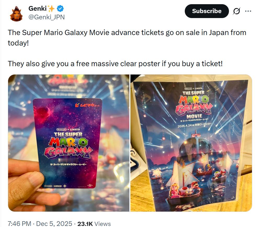 【《马力欧银河》电影开放预售,纪念票、免费海报曝光】近日,游戏博主Genki晒出了《超级马力欧银河大电影》电影预售卡及电影海报。据悉,该电影于12月5日在日本开放预售,购票附赠一张大幅透明海报。《超级马力欧银河大电影》为《超级马力欧》的第2部动画电影,该片改编自任天堂的《马力欧》游戏系列以及2007年游戏《超级马力欧银河》,定于2026年4月3日在北美地区率先上映、4月24日在日本上映。