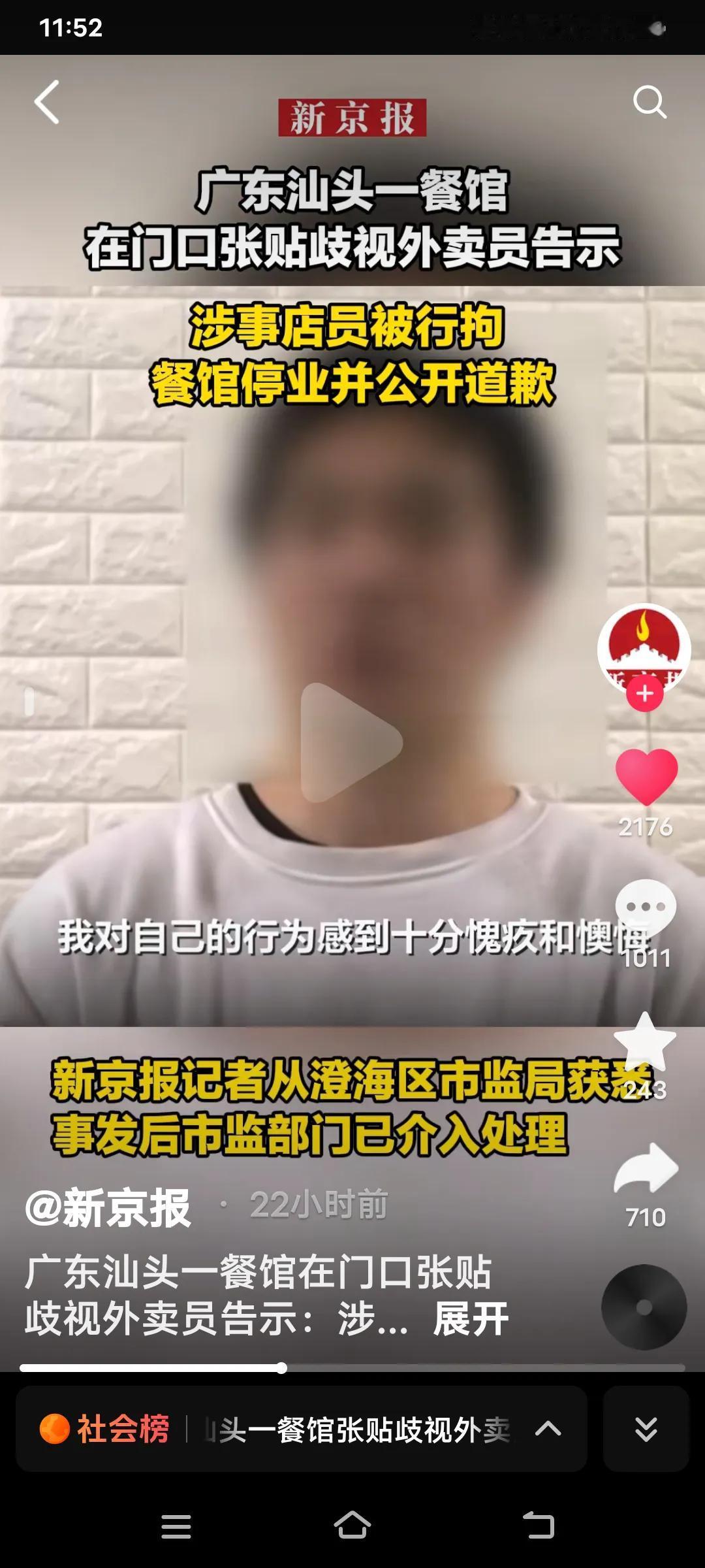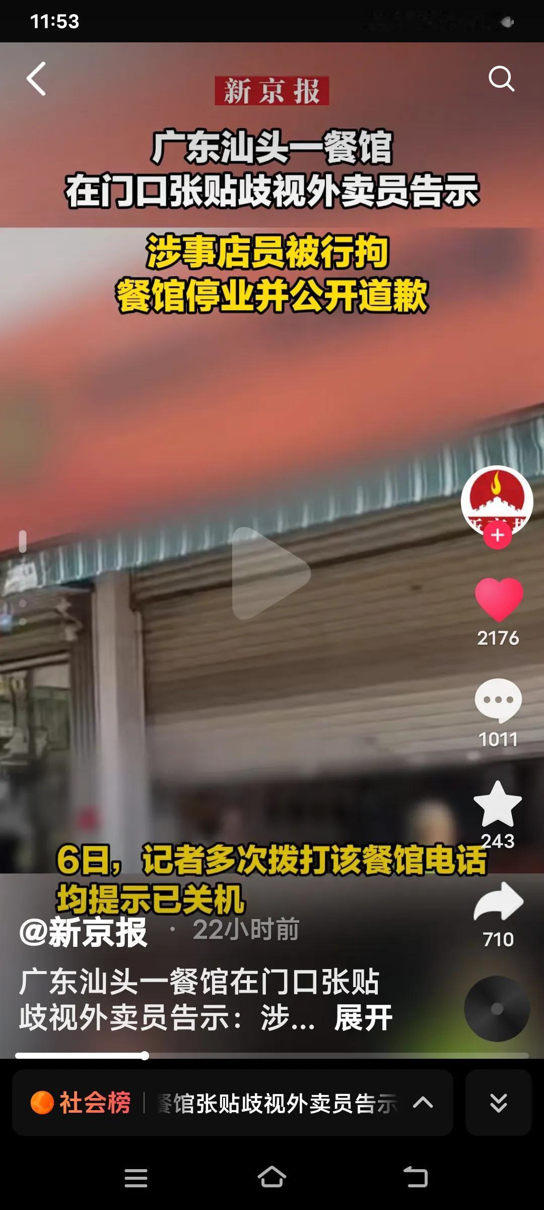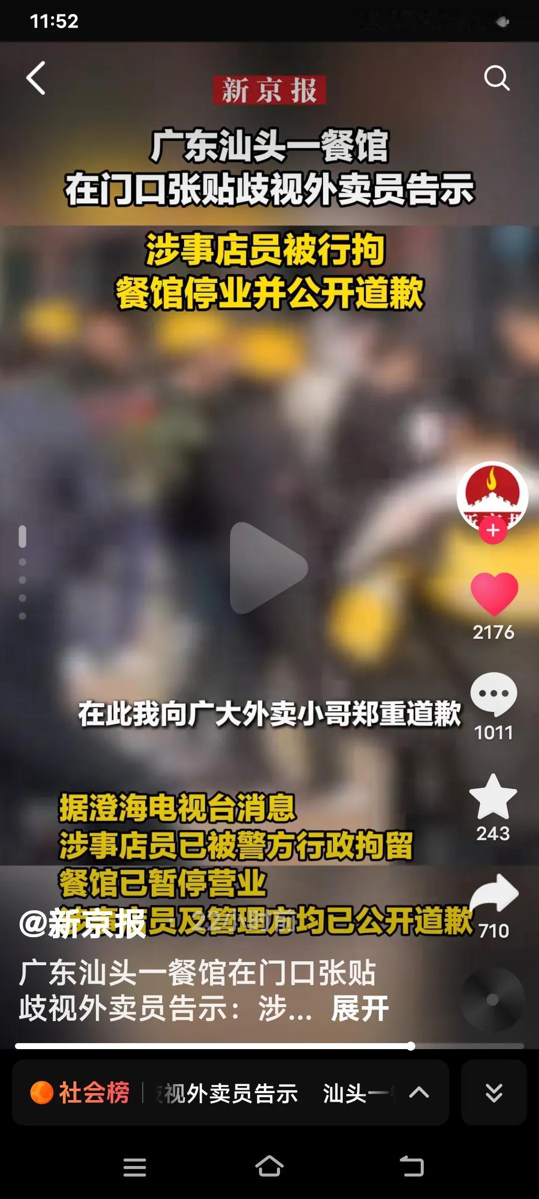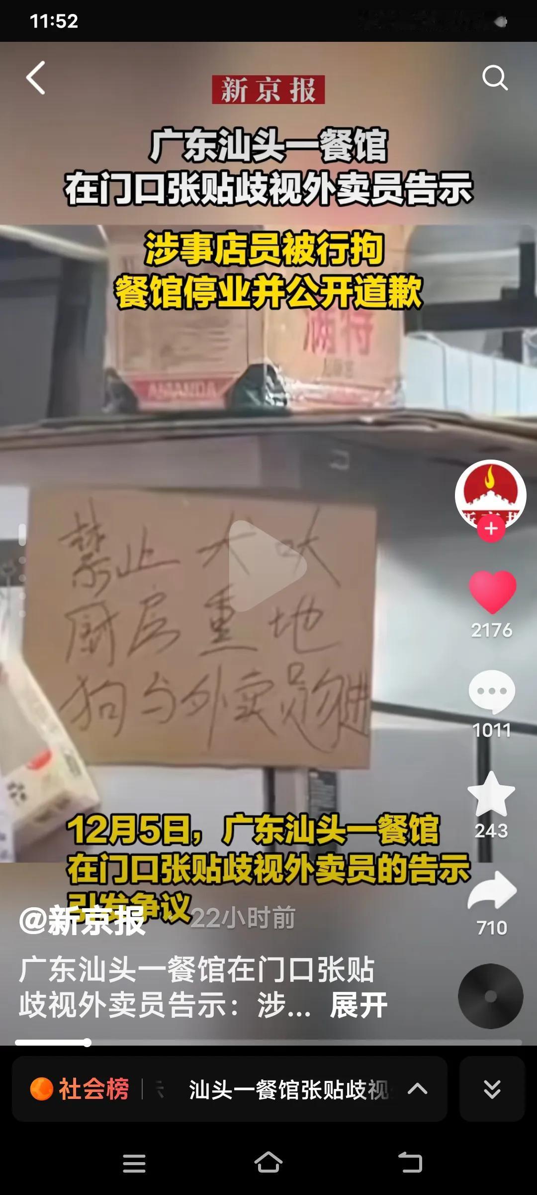 12月5日,广东汕头一家餐馆竟贴出“狗与外卖员勿进”的告示,禁止狗和外卖员进入,此举引发热议。这般歧视与侮辱,谁能容忍?外卖员风里来雨里去,为大家提供便利,却遭受如此对待。 事发后,市监部门迅速介入,涉事店员被警方行政拘留,餐馆暂停营业,店员也公开道歉。评论区有网友说,道歉干嘛?我认为“你做的对”。然而,这样的道歉能弥补给外卖员带来的伤害吗? 尊重是相互的,职业本就无高低贵贱之分。希望此类事情不再出现。毕竟,尊重他人就是尊重自己,为何会做出这样的行为呢?实在荒唐!外卖行业规范 外卖市场规范 外卖服务规范