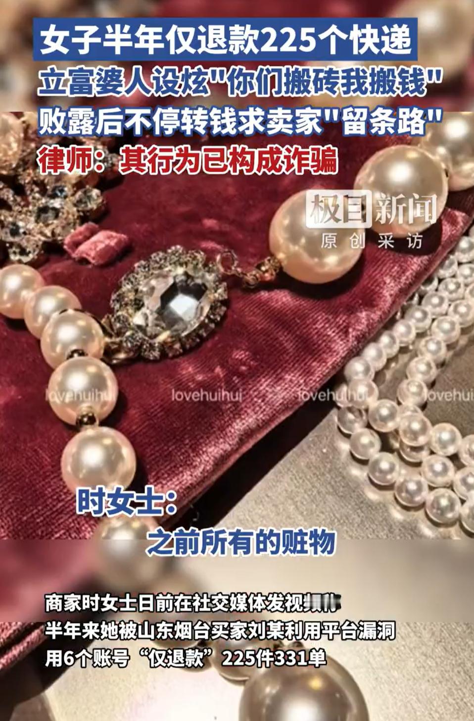 仅退款225个快递女子打造富婆人设 利用平台漏洞,6个账号“仅退款”225件331单,在二手平台和粉丝群内低价销售,商家损失5.4万余元。。。这都是什么脑洞,几万块钱就把自己送进去了 律师称仅退款225个快递构成诈骗
