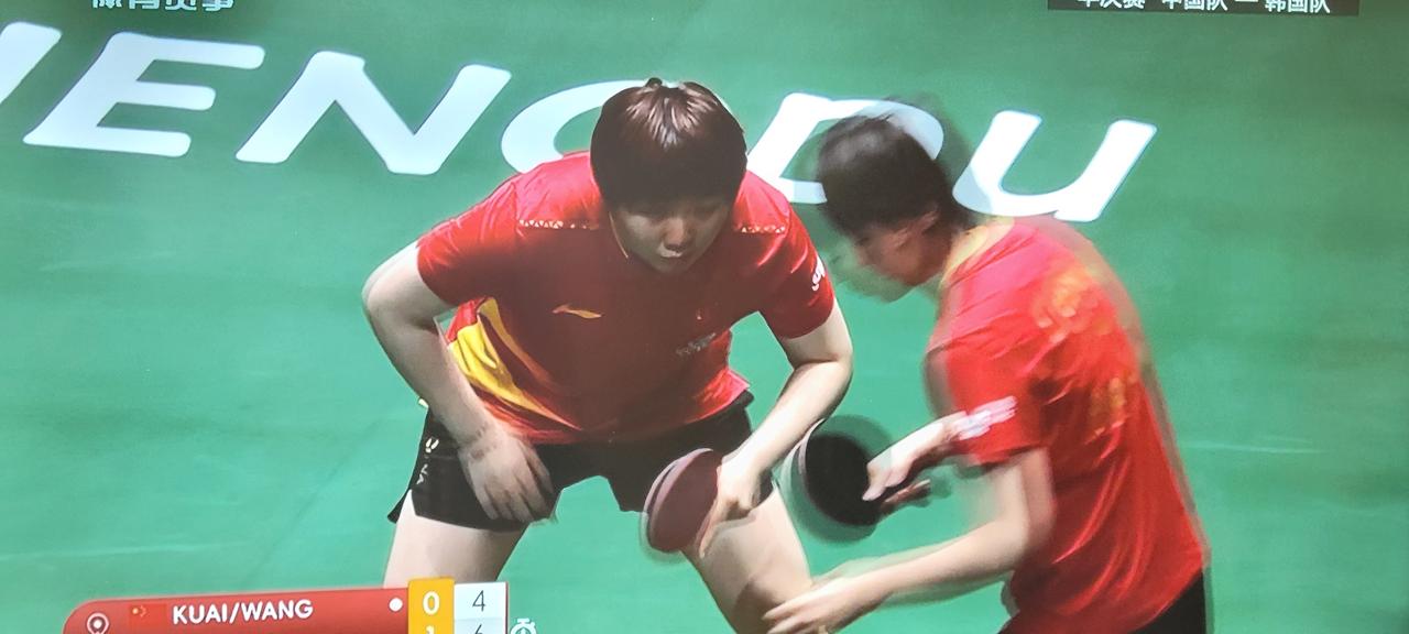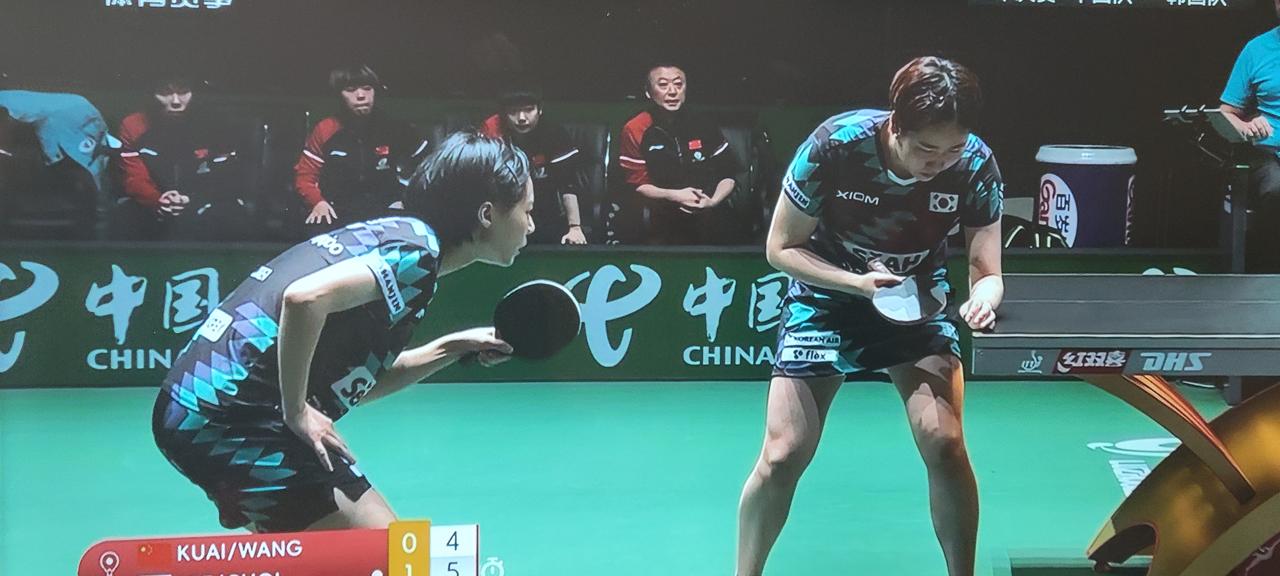 双曼组合1:1逼平韩国队李恩惠组合,从而使中国队8:3战胜韩国队,昂首挺进今晚的决赛! 第一盘莎头组合一路长虹,3:0战胜对手,全取三分。 第二盘大丫头2:1战胜对手,为国乒再拿两分。 第三盘小石头2:1击败对手,给国乒又添两分。 第四盘双曼组合先失一局,第二局在一路落后的情况下,将比分追成9平并以10:9反超对手。在手握4个赛点的情况下,终于以两分的优势战胜对手,从而使中国队8:3战胜韩国队晋级决赛!