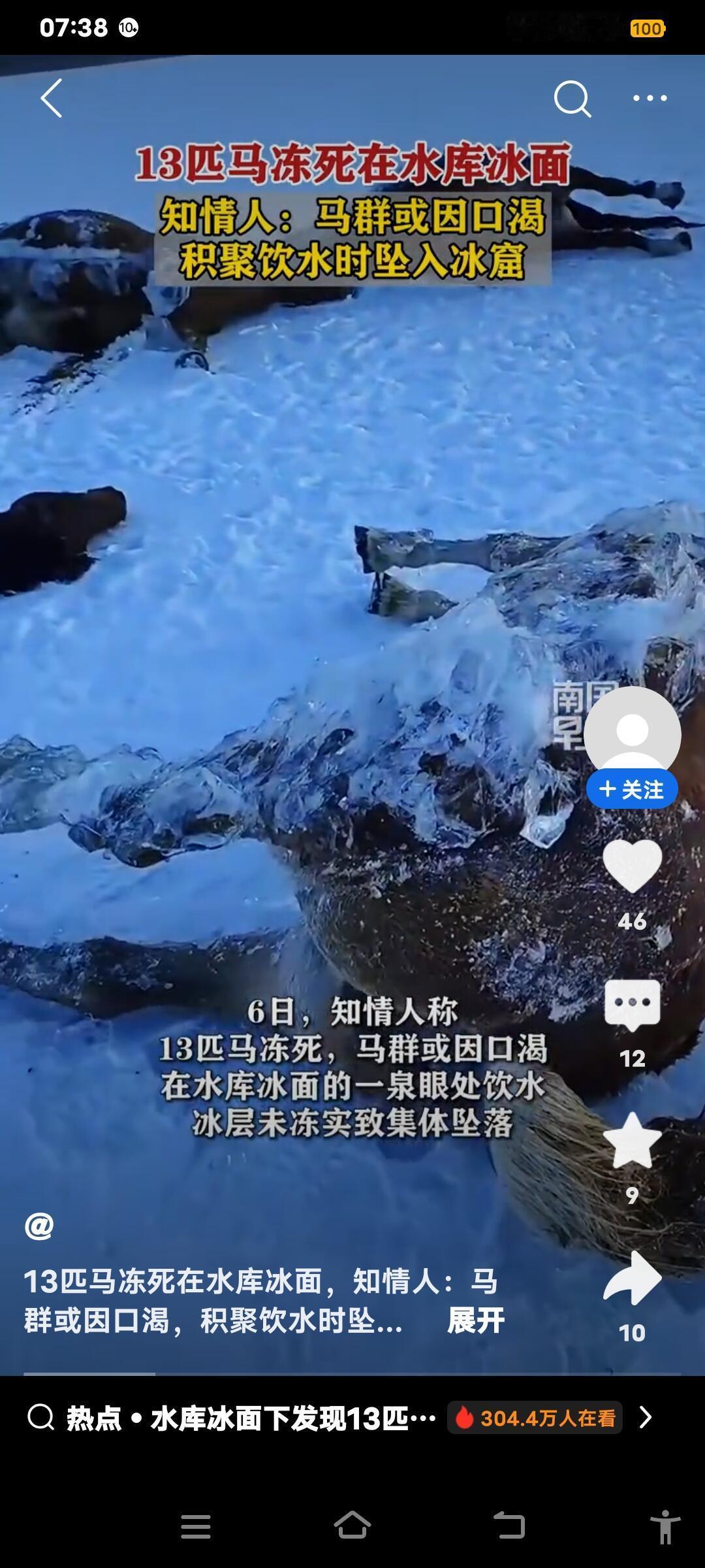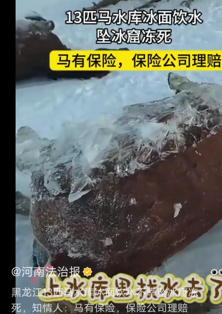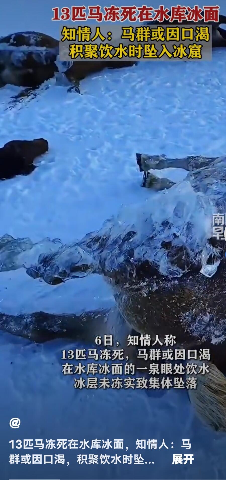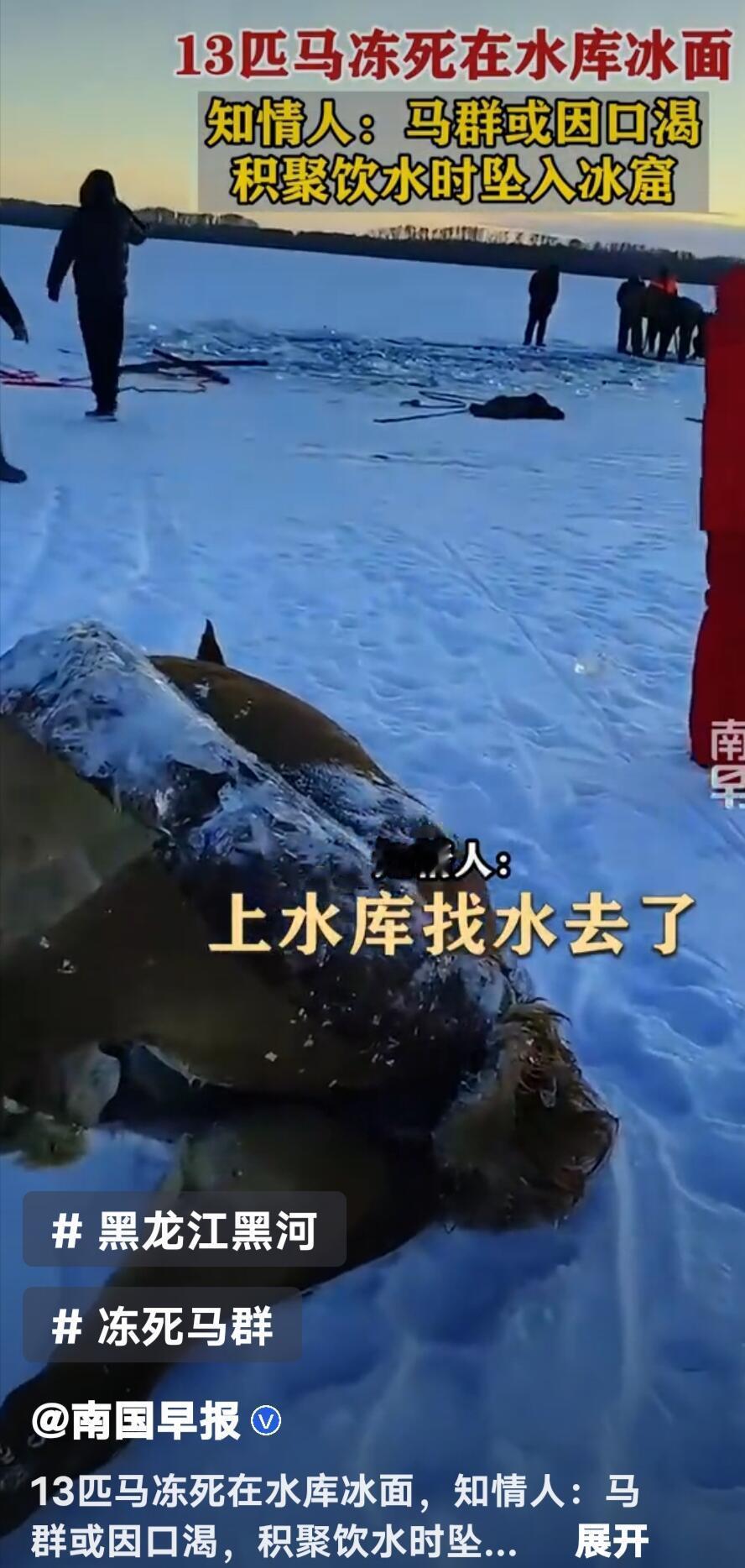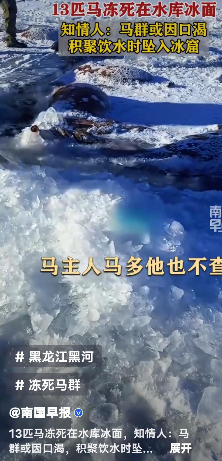 黑龙江东风水库出事了,十几匹马掉冰窟窿里冻死了,真挺惨的。 听说那天零下二三十度,刮着大风下着大雪,马主王先生找不着马,后来发现冰面裂了,马全掉进去冻在冰下面了。这些马是他家主要收入来源,一下没了十几匹,损失三十多万,放谁身上都受不了。 这种事儿其实每年冬天都有听说,不是人掉冰窟窿就是牲口出事。东北冬天水库、河面结冰,看着挺结实,但有些地方冰层薄,或者底下有水流,容易裂。再加上那天暴风雪,马也看不清路,找水喝一踩上去就塌了。 我觉得这事不能光怪天气,安全管理也得跟上。像这种农村地区,水库边上是不是该立个明显的警示牌?村里能不能提醒一下养殖户,冬天尽量别让牲口往冰面上走?尤其极端天气之前,发个通知或者广播一下,可能就能避免悲剧。 另外,对养殖户来说,这么冷的天,是不是得提前给牲口备好饮水,让它们不用冒险去冰面上找水喝?虽然多费点事,但总比出事了强。 冬天野外冰面真的不能乱走,看着平,底下可能就藏着危险。这次是马,万一哪天是人呢?大家平时多留个心,互相提个醒,特别是家里有老人孩子或者养牲畜的,千万注意安全。 希望这种事别再发生了。