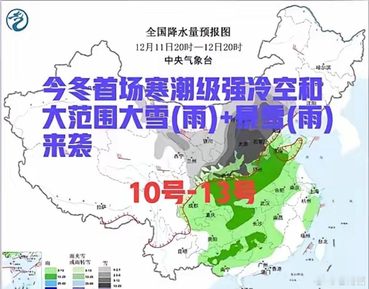 下周大范围雨雨雨雪雪雪眨眼间今天已是12月7号,农历十月十八日,一晃,2025年进入了倒计时,离2026年元旦已不足一月时间,眼看一年的光阴又将结束,再看看自己还是一事无成,两手空空,真有些失落之感!再者,今天将正式进入大雪节气,进入大雪节气,意味着仲冬时节将正式开始,“大雪”是我国廿四节气中的第二十一个节气,也是进入冬天之后的第三个节气。在《月令七十二候集解》中对大雪的解释为:“大雪,十一月节。 大者,盛也。 至此而雪盛矣。 ”,据古籍《三礼义宗》记载:“大雪为节者,行于小雪词条为大雪。时雪转甚,故以大雪名节。”“小雪封地,大雪封河”,进入大雪节气,此时,北方有“千里冰封,万里雪飘”的自然景观,南方也有“雪花飞舞,漫天银色”的迷人图画。这句老话的意思是说,到了大雪节气,河里的冰都冻住了,人们可以尽情地滑冰嬉戏。可见,进入大雪节气l“过冬模式”将正式拉开帷幕。人常说"大雪不封地,不过三五天″,其意是说,如果大雪节气时土地还没有冻结(“不封地”),那么最多三五天内就会开始冻结。这里的“封地”指土地因寒冷变得坚硬,无法耕作。也就是说根据气候规律,大雪节气过后,很快冷空气会大举南下,气温骤降,通常在3-5天内土地就会冻结,进入严寒期。今年的天气也很应景,这不,中央气象台预计。大雪过后,12月10号~13日,今冬以来最强冷空气将自西向东影响我国大部地区,受其影响,气温将普遍下降6~10℃,北方地区局地甚至降温可达12~14℃,而且还伴有4~6级偏北风,北方部分地区阵风7~9级。这次冷空气不但给我国大部分地区带来大降温天气,而且还携带了大范围雨雪天气,预计,11~13日,我国中东部地区将出现今冬首场大范围的雨雪天气,具体降雪的地方主要集中分布在,新疆、西北地区、华北、黄淮、内蒙古中部、东北地区中南部等地,以上地区普遍将有小到中雪或雨夹雪天气过程,甚至局地还会出现大雪或暴雪天气。具体降雨的地方主要集中分布在,四川盆地、江汉、江淮、江南、华南及贵州等地,以上地区将普遍将会出现小到中雨天气,而在广西中部、广东北部、湖南南部等地局地甚至还有大雨或暴雨天气。综述:进入大雪节气后,气候开始冷暖交换,冷空气影响频繁起来,雨雪也相应增多,昼夜温差逐渐加大,虽然最近几天,我国多地又开启升温模式,但这次冷空气威力不可少见。除给我国大江南北带来骤烈降温外,还携带了大范围的雨雪天气,所以希望朋友们在冷空气来临之前,提前做好防寒保暖措施,根据实际气温变化,随时增添衣服,而且特别在早晚时段外出要做好保暖措施,以防感冒。