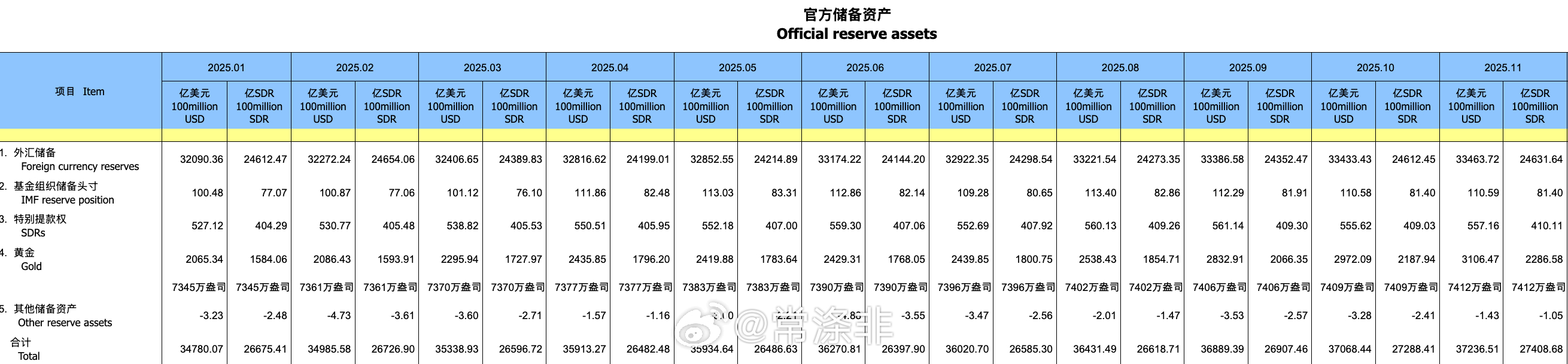 数据 中国央行连续第13个月增持黄金,2025年11月末黄金储备增加3万盎司至7412万盎司(10月增加3万盎司),以美元计增加134.38亿美元。11月末外汇储备环比增加30.29亿美元(10月增加46.85亿美元)至33463.72亿美元。黄金财经资讯老常政经常涤非观点