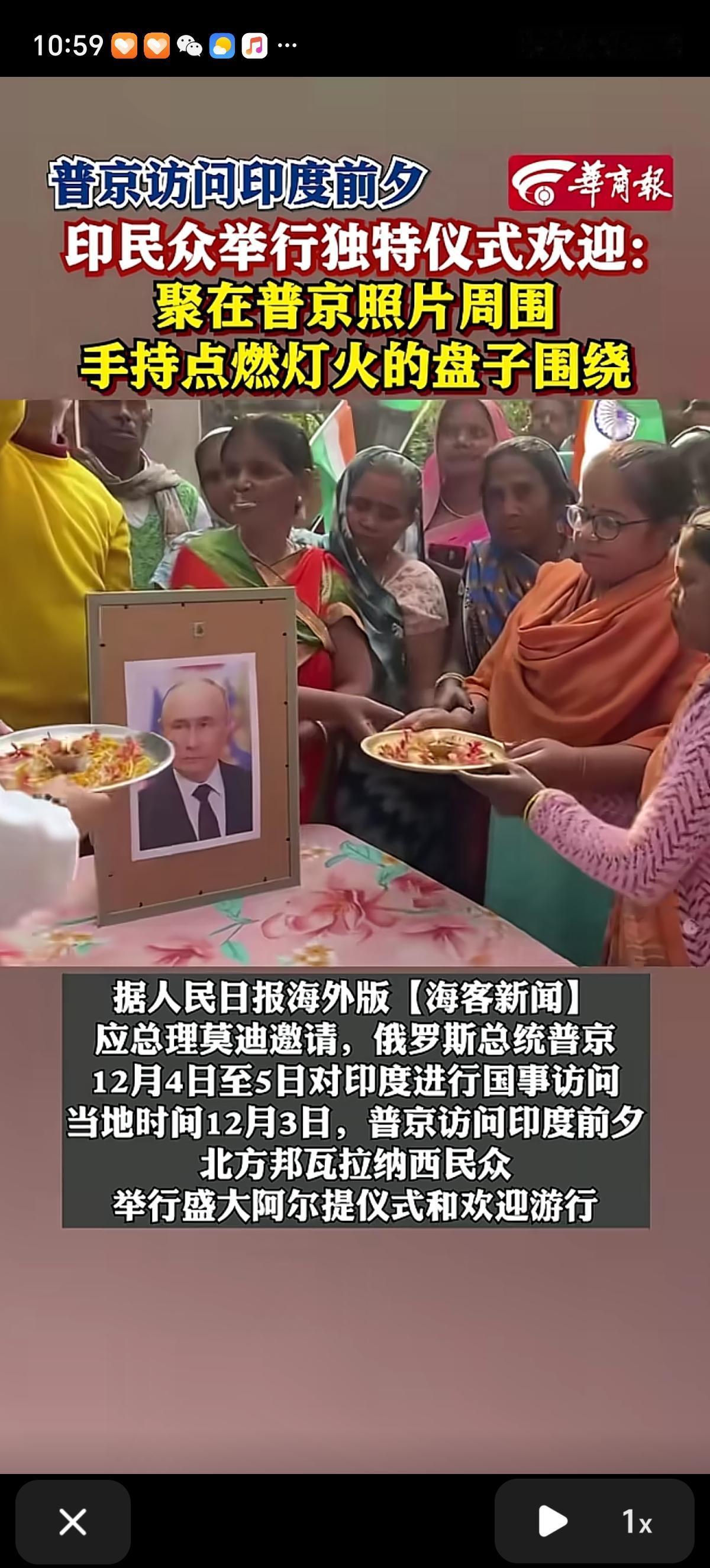 原来印度迎接最尊贵的客人是这样的,准备好供桌,烛火,普京的相册,有万寿菊花环和姜黄粉的盘子,开始诵经和祈福赞歌,顺时针围绕着客人的相册绕圈。 仪式尾声还要把灯火都放入恒河水,寓意着为最尊贵的客人普京照亮前方的道路。 印度朋友真是太热情了,仪式感满满!