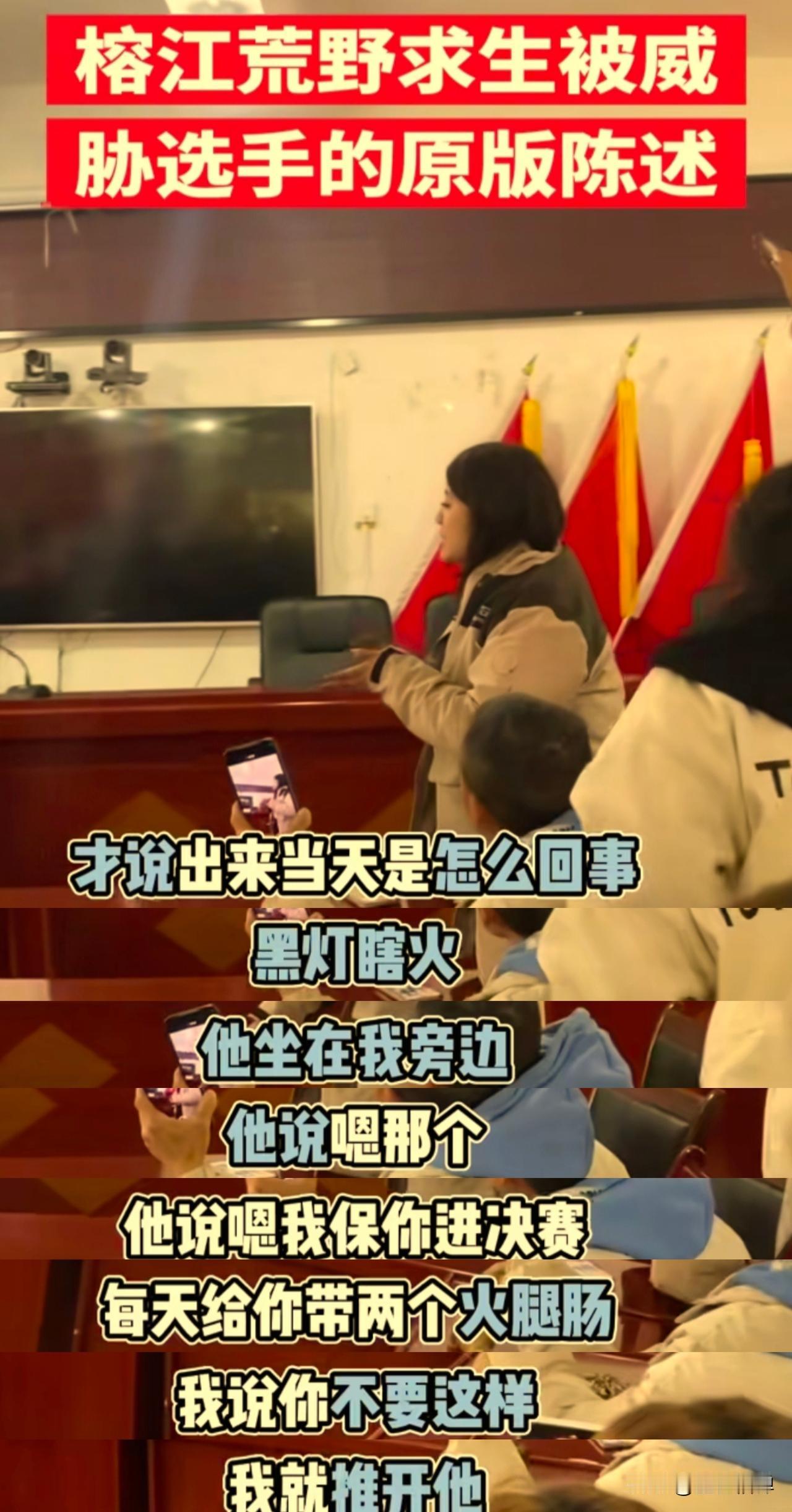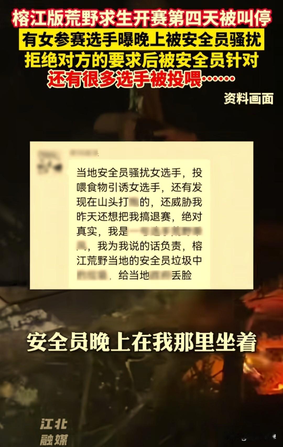 贵州榕江版荒野求生开赛第四天被叫停,出现很多选手被投喂的情况。有女参赛选手爆晚上被安全员骚扰,拒绝对方的要求后被安全员针对,有男选手说他亲眼看到安全员摸女选手的。 这位女选手说安全员晚上黑灯瞎火的坐在她旁边,说陪她到天亮,保证她可以进决赛,拉了一下她的手,说每天可以给她带两个火腿肠。 她没答应,说你不要这样,这样会违反规定,安全员说你放心,我老表就是管这片山的。 她推开了安全员,再到后面打野的时候,她好不容易生的火也被他们灭掉了。第二天她正好来例假了,找安全员要卫生巾,她们只给一个,说她不知好歹。 有参赛选手反映说,有很多选手被投喂,现场掏出了白萝卜跟大米,他们天天挨饿,这样公平吗? 来源:江北融媒 荒野求生比赛 荒野求生女选手 荒野求生女性 荒野求生总决赛 野外求生赛