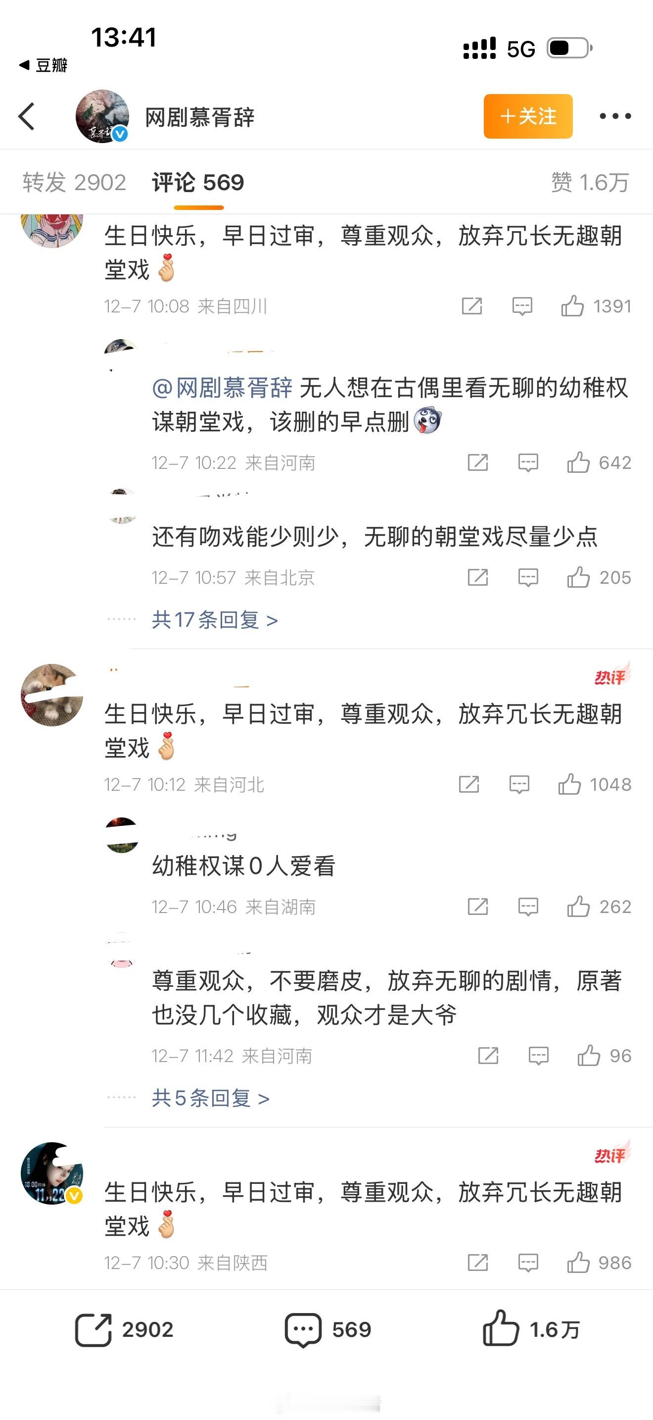 慕胥辞官博下的评论,要求放弃冗长无聊的朝堂戏,尊重观众。