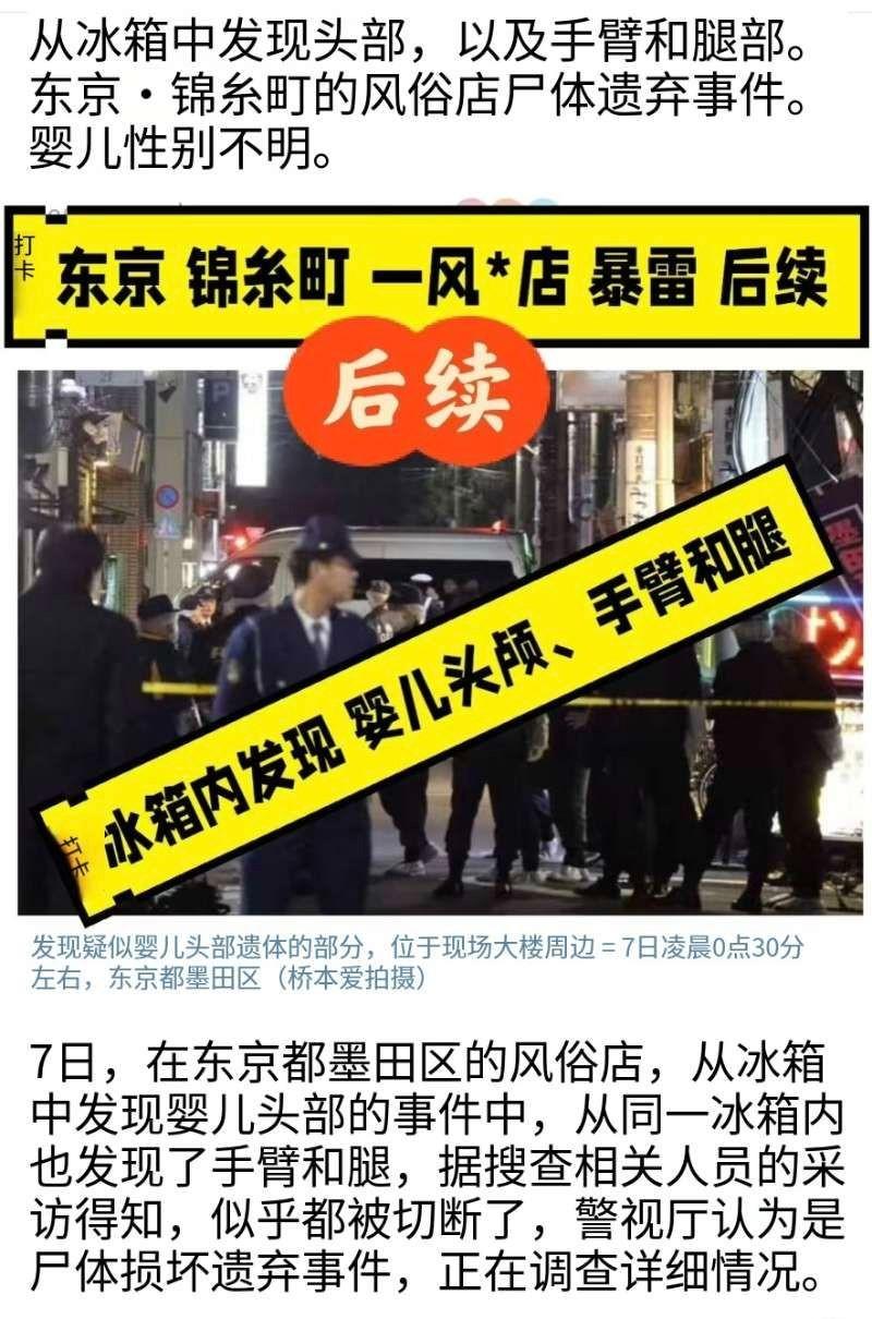 想不到2025年了,日本还能发生这样的案子。一名被推测为一岁以内的婴儿被肢解,部分身体被放进冰箱冷冻。 据日媒报道,12月6号晚上,东京锦系町江东桥4丁目的一家风俗店的清扫人员发现一婴儿头。 后续消息是在这家二楼员工休息室的冰箱冷冻室里又找到婴儿被肢解的四肢,但没有躯干。 网友说锦系町那边出这种事不奇怪,20多年前在附近公寓里也发生过一个类似案件(受害者是成年人),到现在案子都没破。