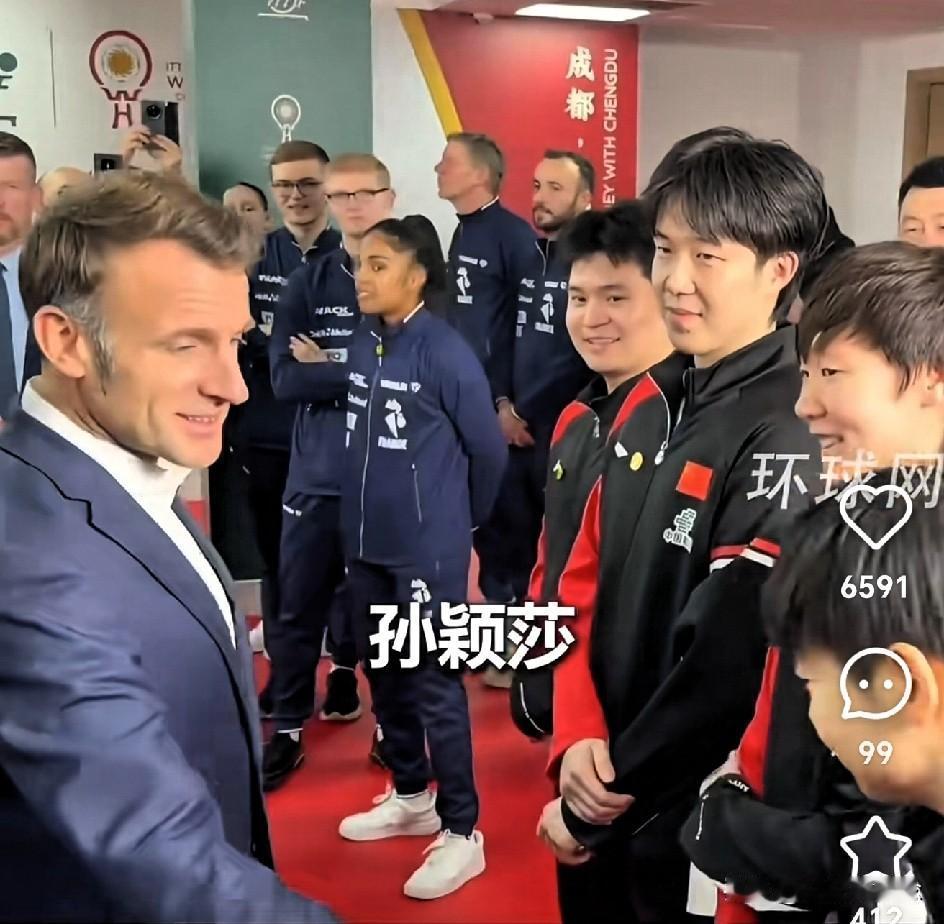 王楚钦和乒协主席王励勤都没想到,法国总统马克龙竟然是孙颖莎的铁粉。 一般来说,像法国总统这么忙的人,铁杆粉丝应该是只有一个,那就是莎莎老爸。谁知道,马克龙结束四川大学访问后,直奔成都四川省体育馆,要和孙颖莎、王楚钦“过几招”。 孙颖莎略显腼腆,一脸意外。 随后,马克龙特意要求孙颖莎发球,前三次都没接住,自己先笑了,现场氛围十分融洽。 搞笑的是,两人见面时,马克龙用中文喊了“莎莎”,这说明他可是有备而来的。 其他粉丝都没这个待遇啊,绝对是莎莎含金量最高的粉丝。 这场跨界互动也太圈粉了! 马克龙身为总统,特意挤时间追着和孙颖莎打球,还提前备好中文昵称“莎莎”,妥妥的顶级铁粉实锤。 孙颖莎的表现更亮眼,不卑不亢尽显专业,既没刻意放水丢运动员本色,又悄悄调整发球节奏照顾对方,分寸感拿捏得恰到好处。 网友说: 连马克龙都是莎莎的粉丝。莎莎,加油,继续闪耀!💪 这哪里是简单的打球,分明是最温暖的文化交流。 50年前乒乓外交搭桥,如今孙颖莎用实力和友善延续这份情谊。 不得不说,莎莎的魅力早跨越国界,而这样平等又真诚的互动,比任何话术都更能拉近距离,这才是中国年轻人该有的底气和格局!