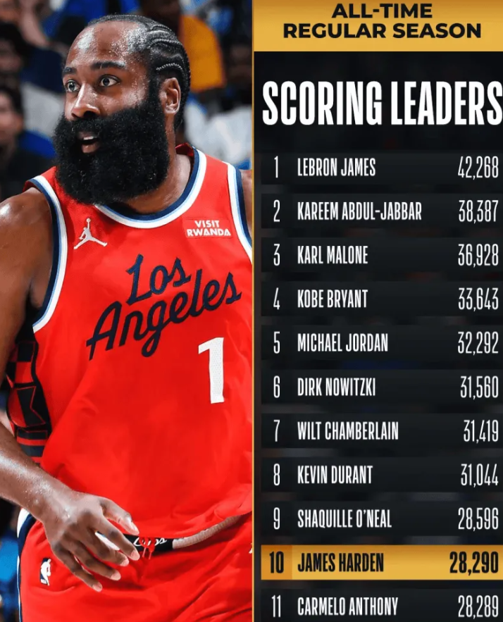 本场过后,哈登生涯常规赛总得分28303分,超越安东尼升至历史第十,距离第九的沙奎尔-奥尼尔还差293分。