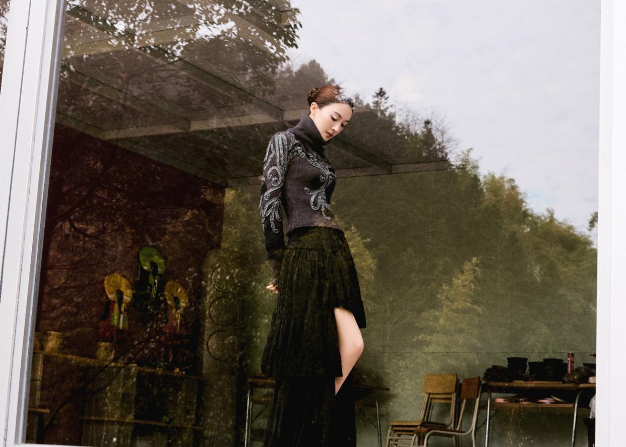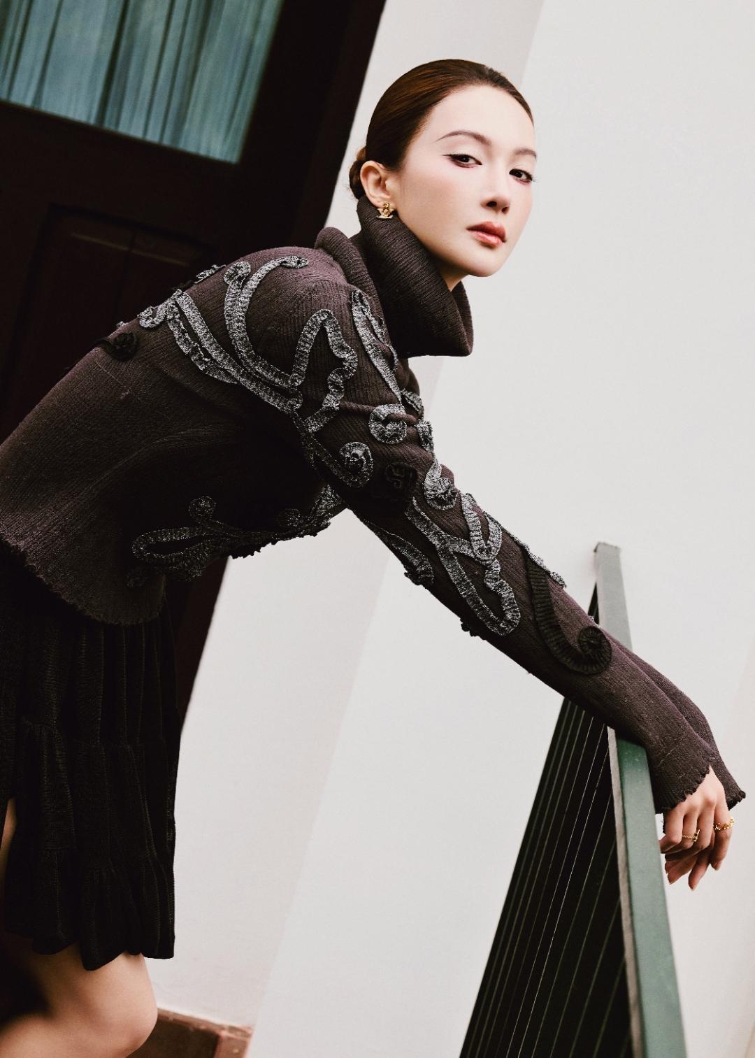 金晨新片|把秋日森林穿在身上的美神】 深棕高领针织+银线刺绣,像把秋日枯枝的肌理缝进了衣衫🌰 墨黑丝绒裙的不规则开衩,是优雅里藏的那点「野」 盘发衬得天鹅颈比落叶还舒展,眼尾那抹粉调,又软得像沾了晨露的秋花