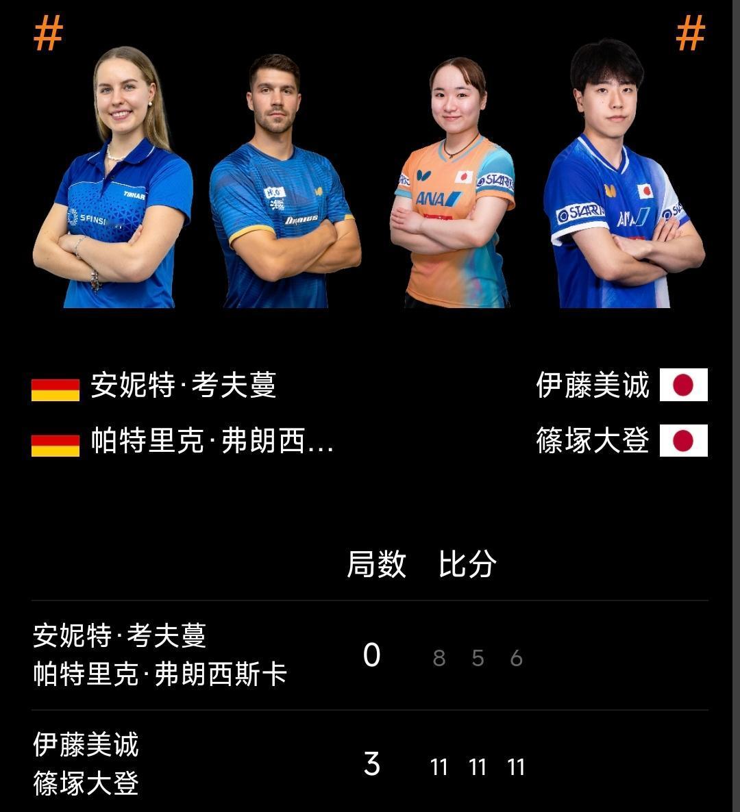 日本8-3战胜德国晋级决赛,将与国乒争冠! 2025年成都混合团体世界杯 半决赛,日本以总比分8比3战胜德国晋级决赛! 混双日本派伊藤美诚/筱塚大登,这个组合与以前伊藤美诚和水谷隼的打法相似,2-1战胜弗朗西斯卡/考芙曼;张本美和女单2-1战胜温特;松岛辉空1-2邱党;在双打比赛,松岛辉空/户上隼辅以2-0胜出! 日本的阵容多变,今天张本智和没上了,像昨天那样丢6分的话,谁都不敢让参加! 晚上国乒与日本,估计日本将派张本美和打双打,单打很可能会上伊藤美诚或早田希娜上场!