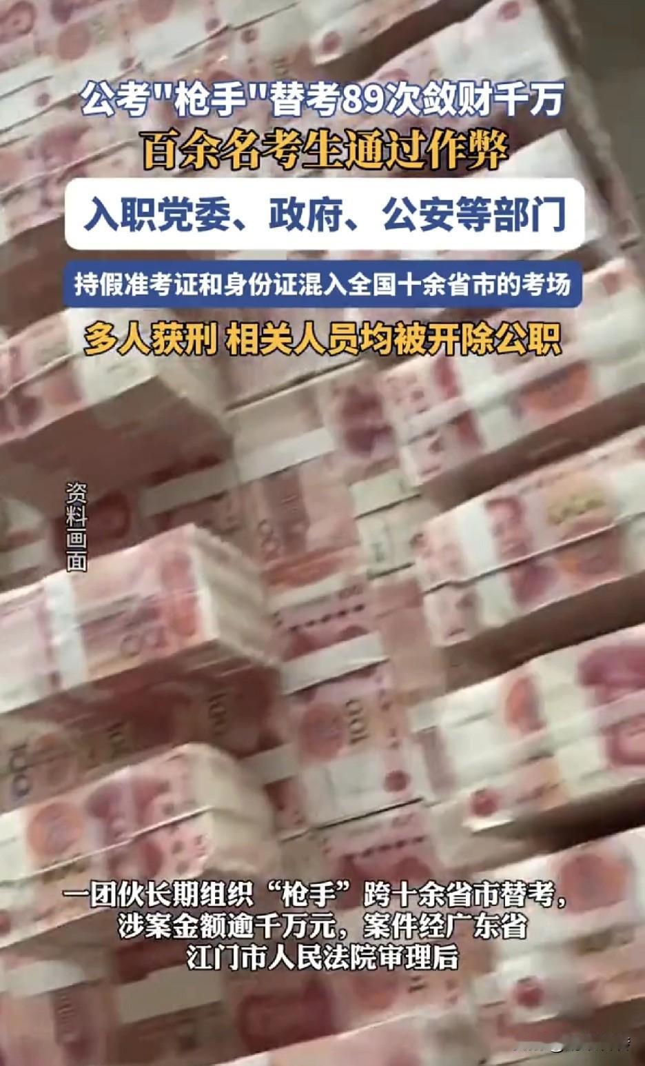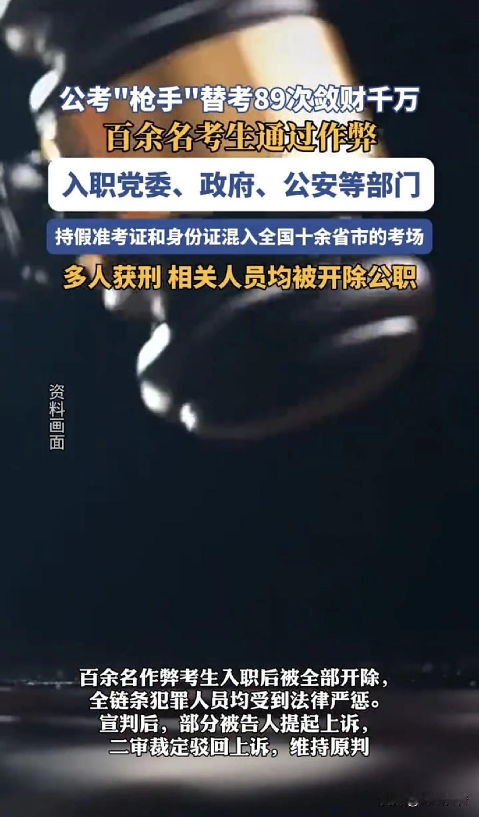 一团伙长期组织“枪手”,跨越十余省市,持假准考证和身份证组织替考,百余名考生入职党委、政府、公安等部门,想想是多么的可怕。目前组织者已被依法严惩,百余名作弊者被开除公职。 要我说应该枪毙,必须从严从重惩处,因为失去了社会公平,也就失去了人心,这些作弊者掏空的是整个社会的公平基石。公考作弊 作弊案例 招考作弊