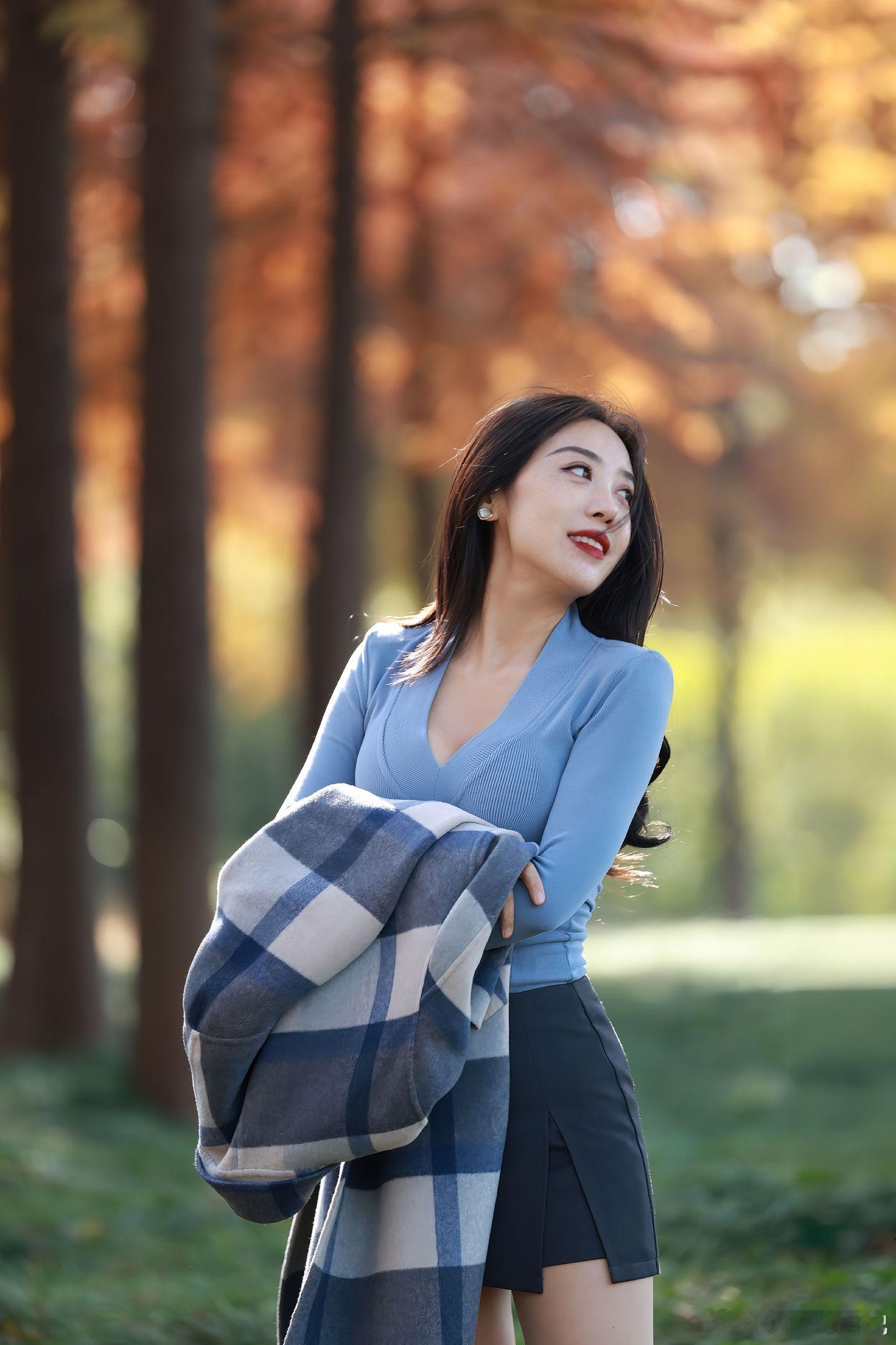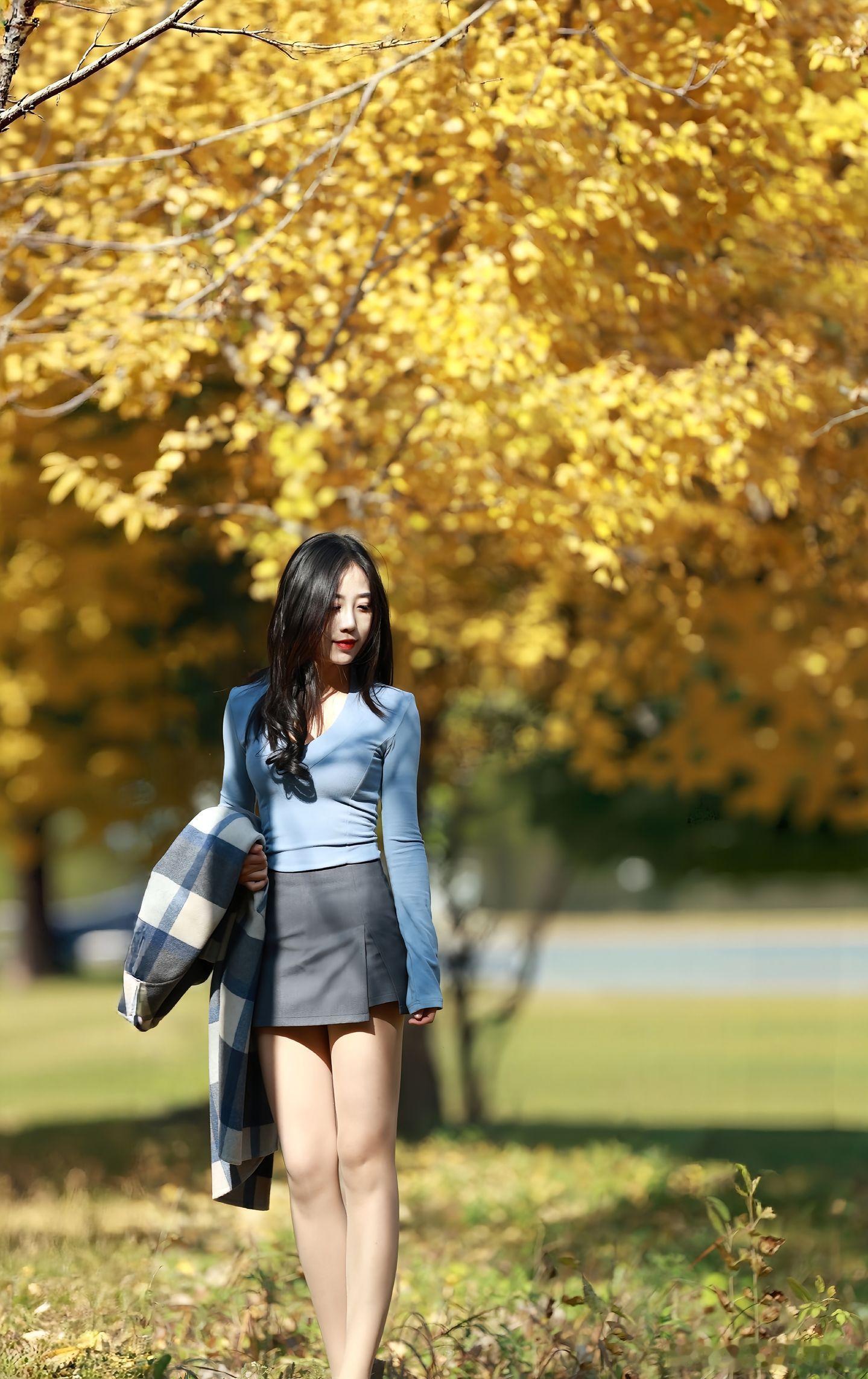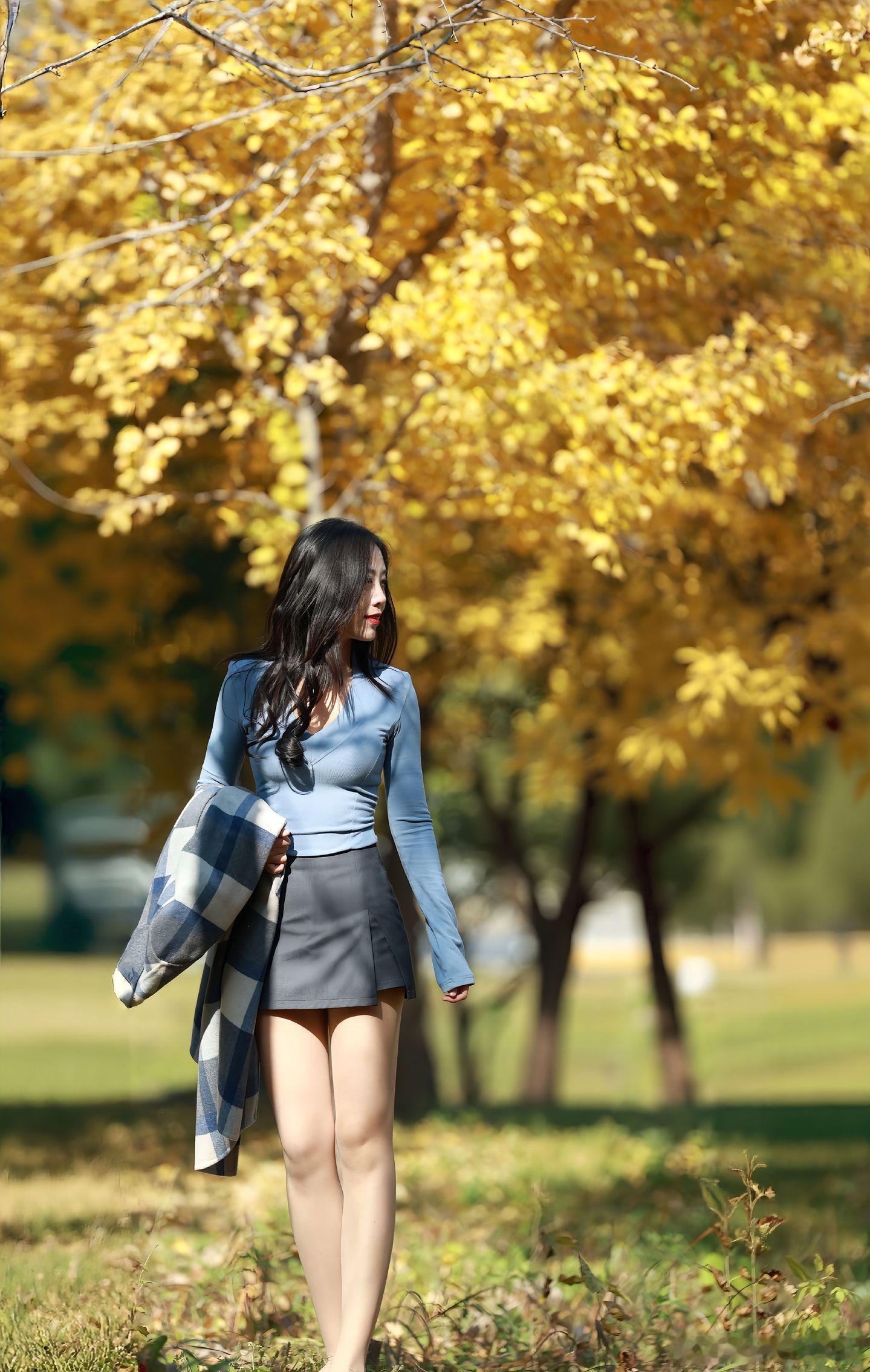 今天穿什么 蓝色长袖打底衫,灰色短裙,肉丝平底鞋,搭配格子围巾,回头率满满美女绘梦长廊