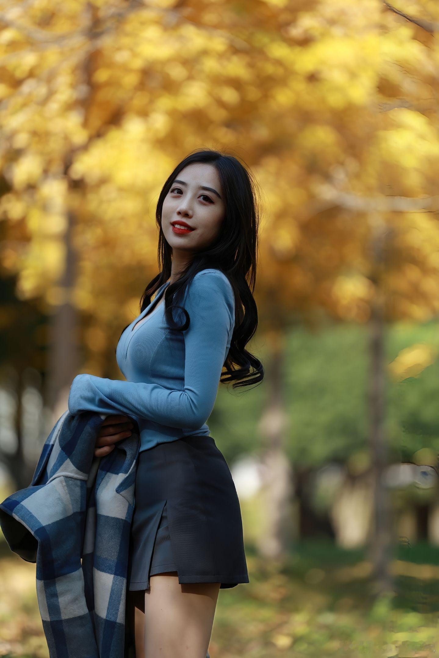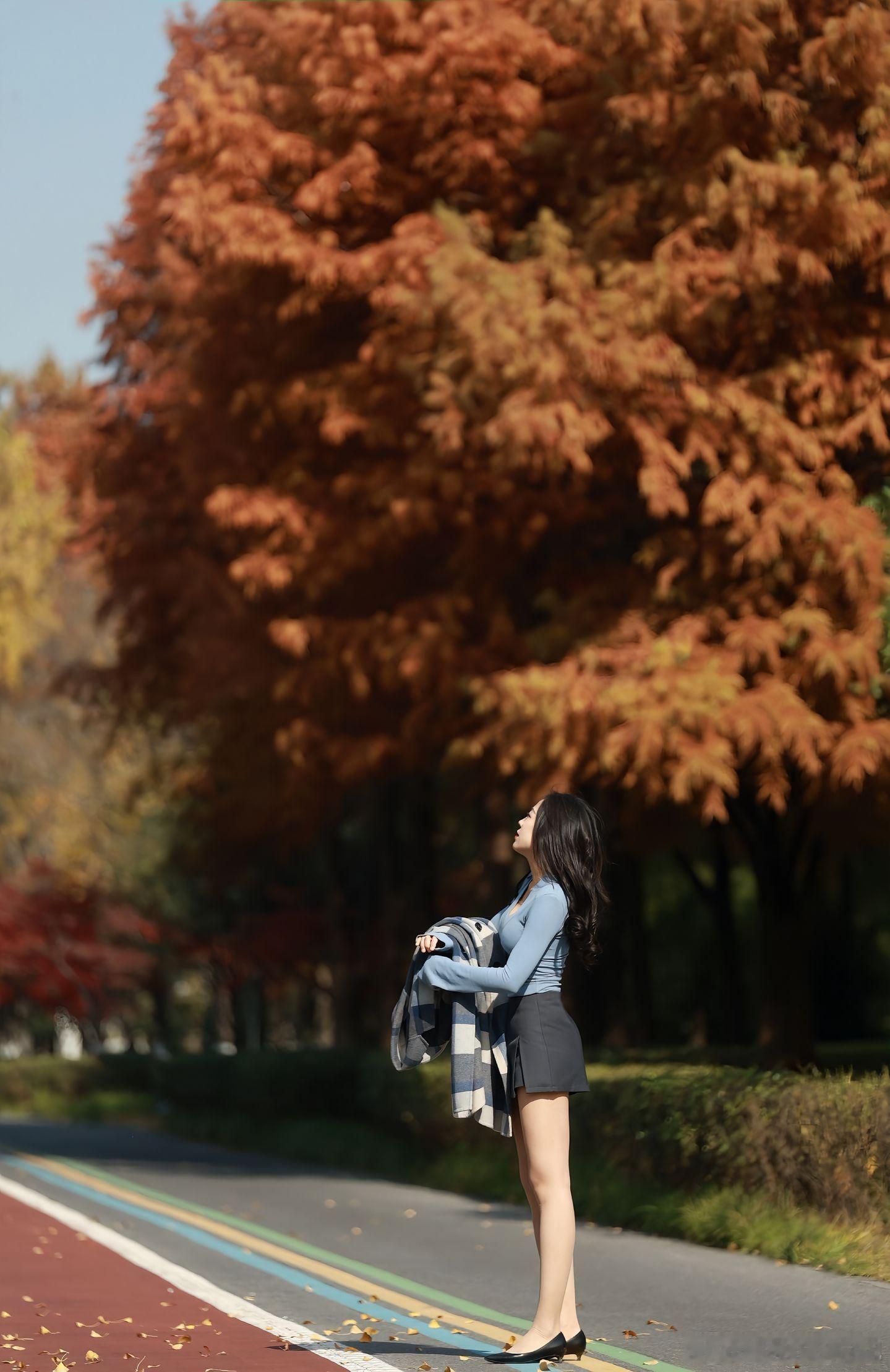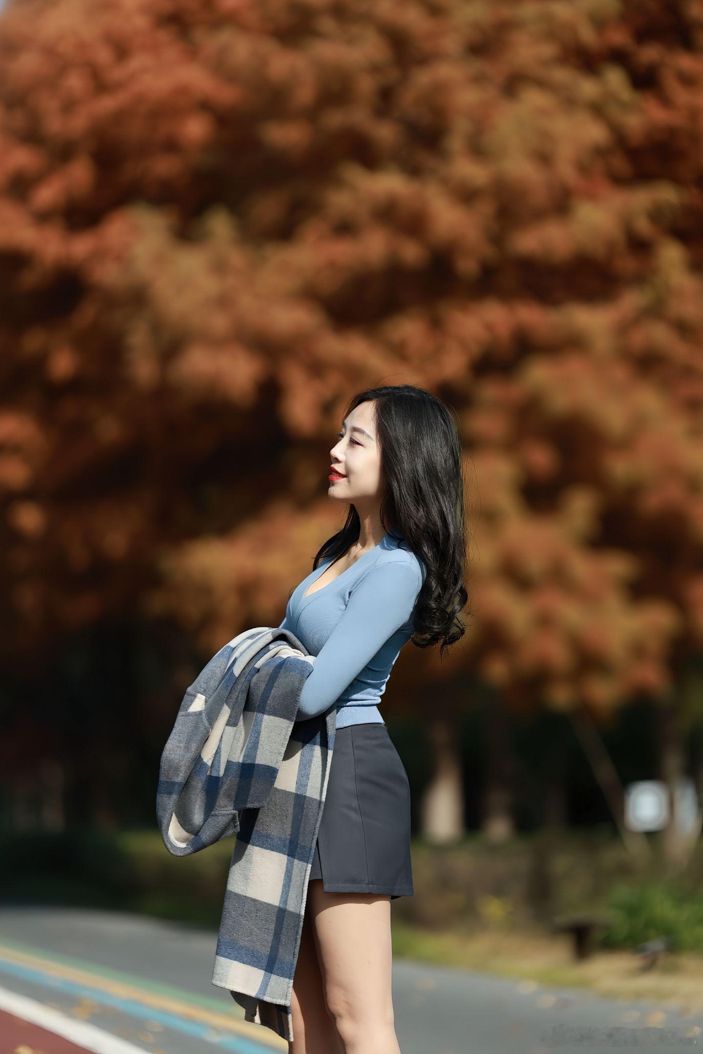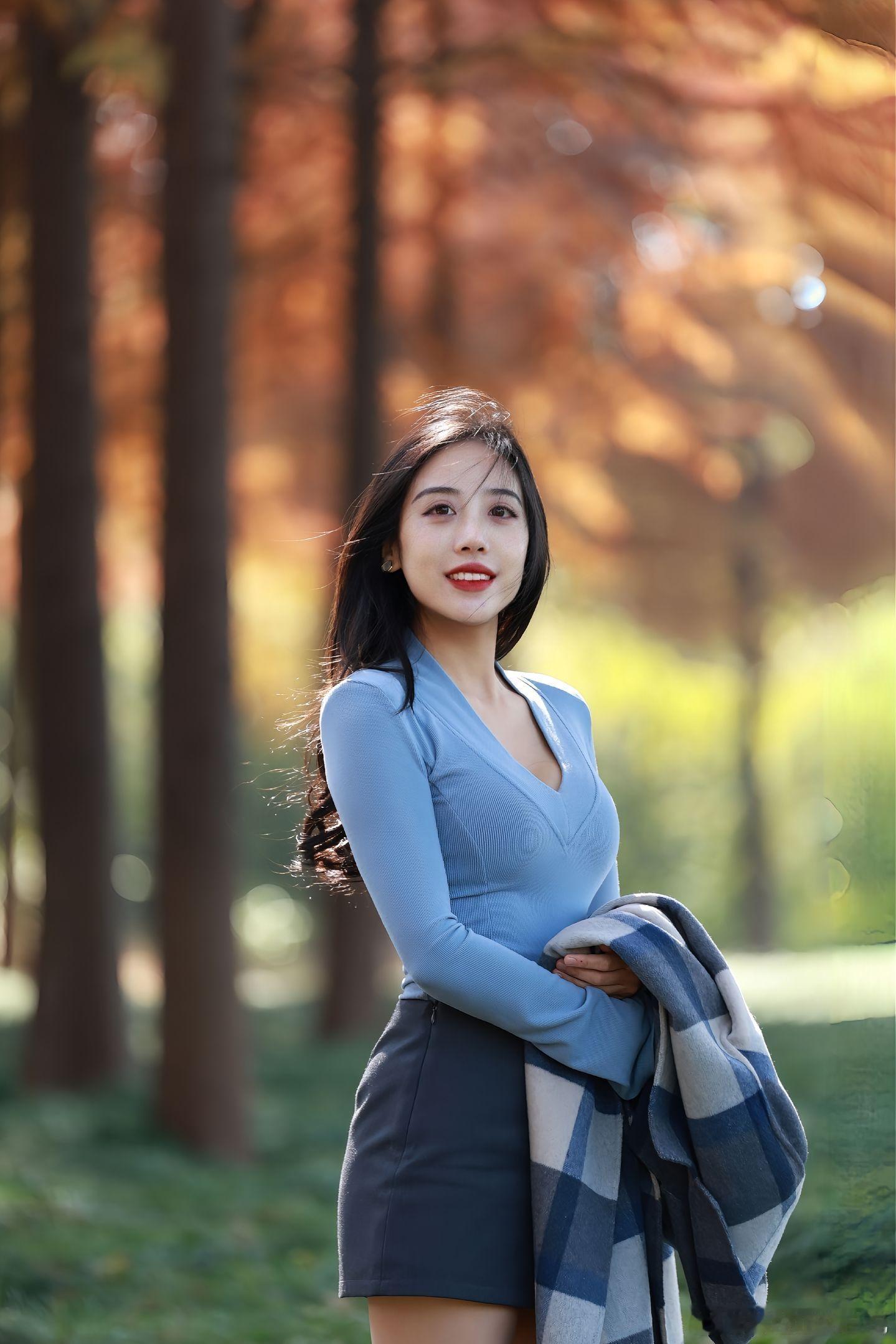 今天穿什么 蓝色长袖打底衫,灰色短裙,肉丝平底鞋,搭配格子围巾,回头率满满美女绘梦长廊