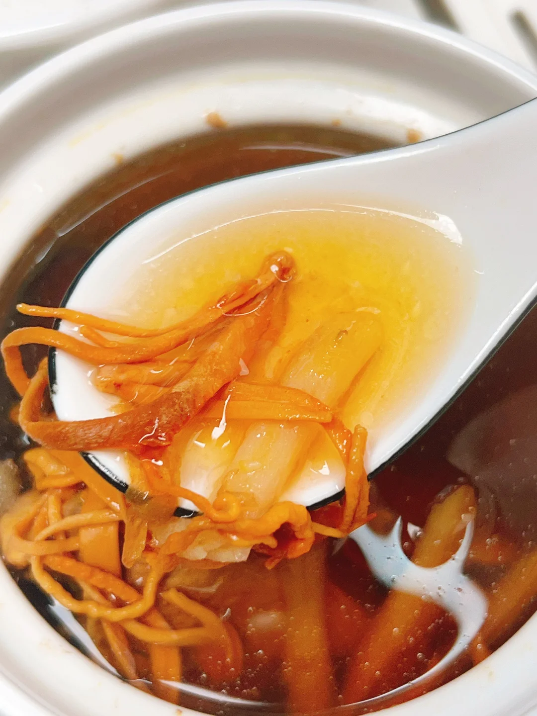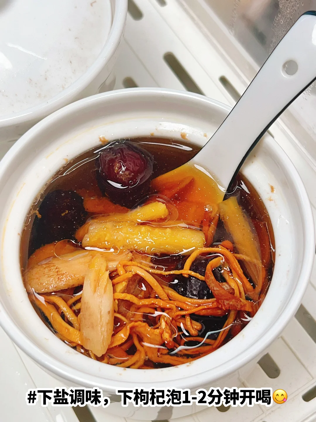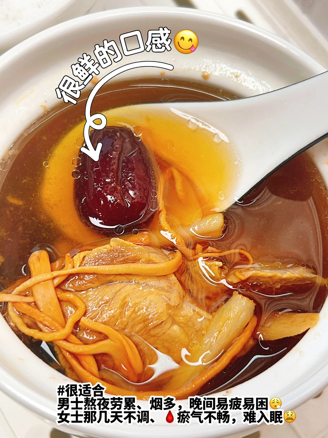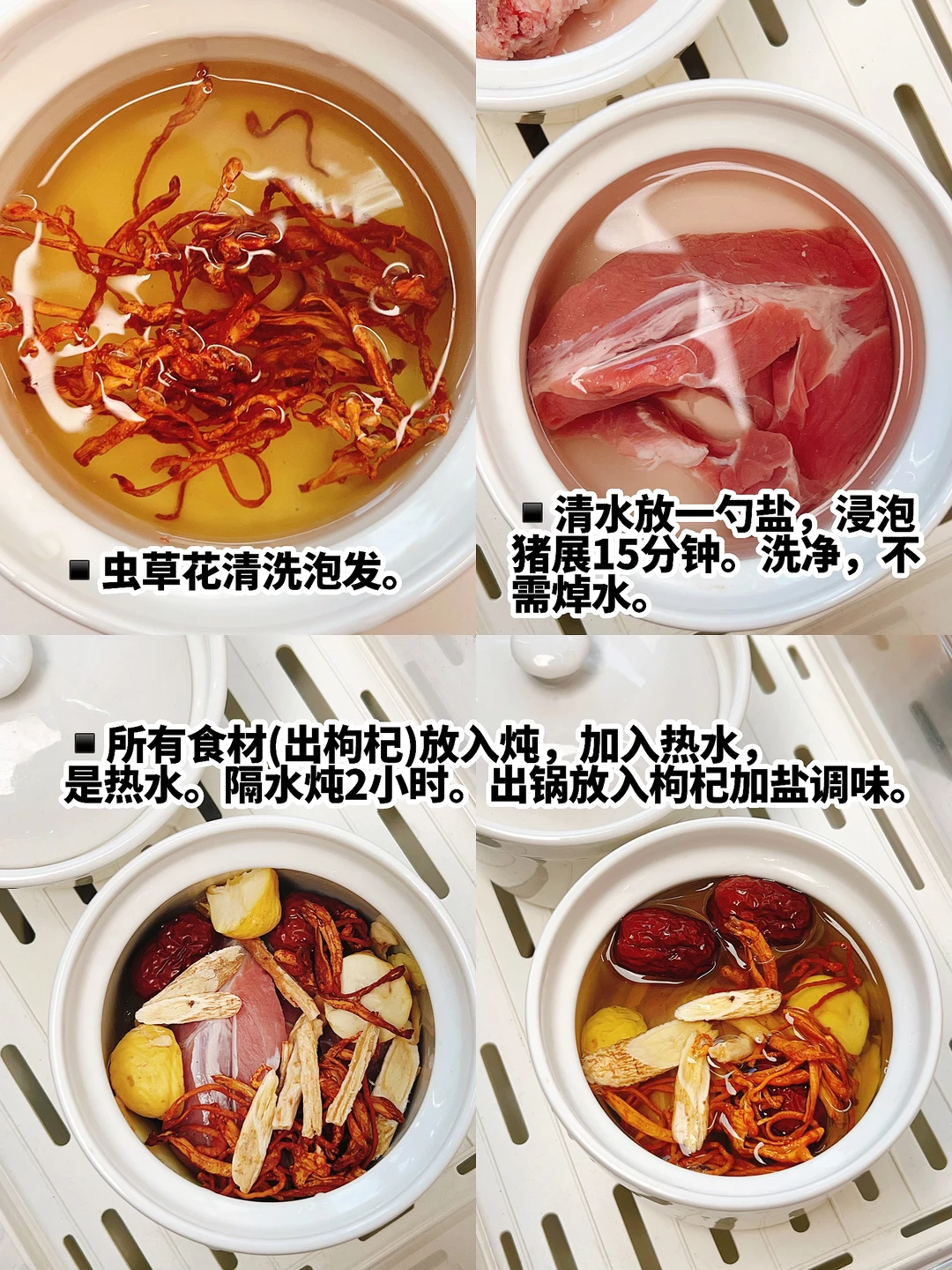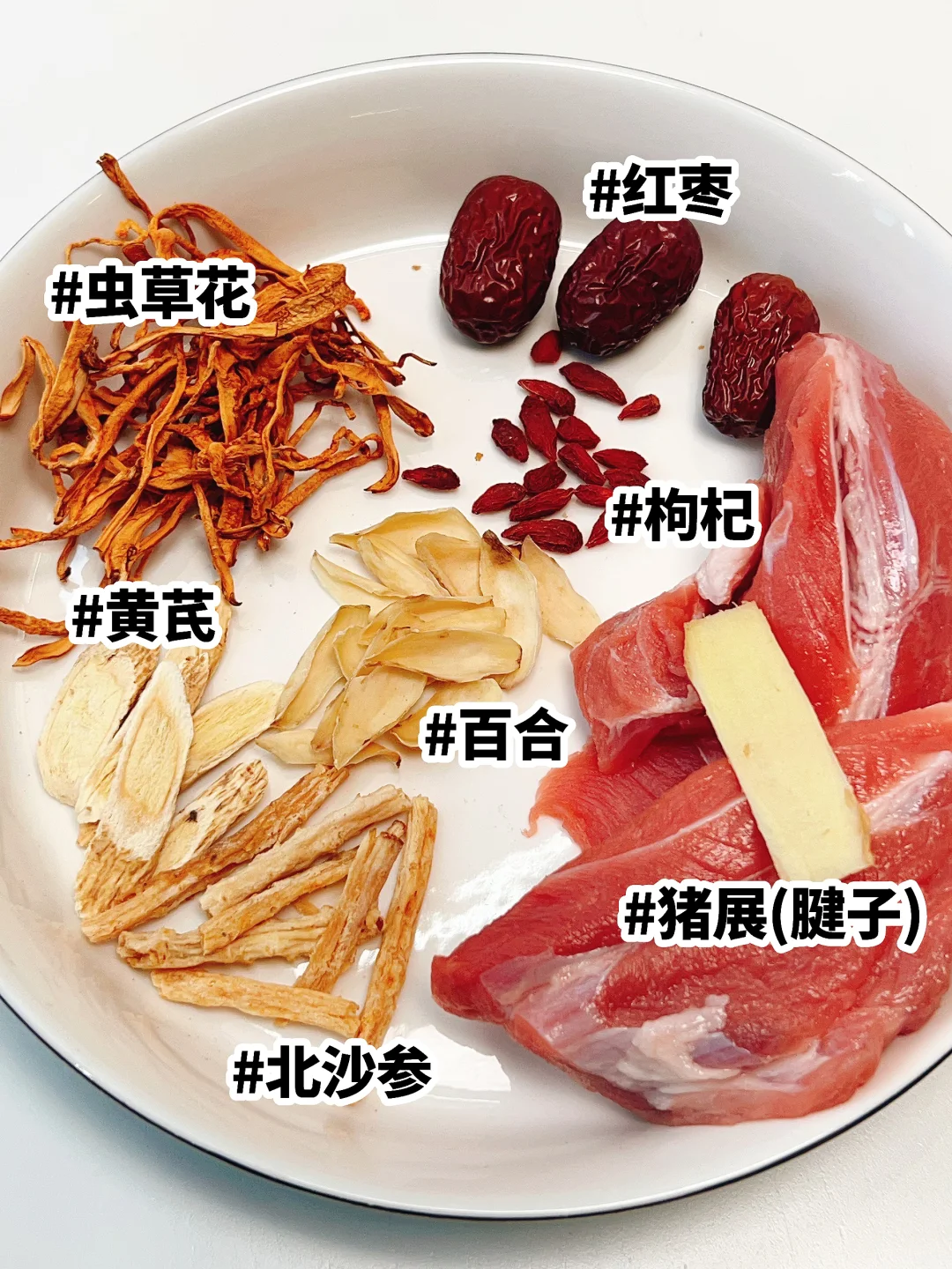 现代夫妻熬夜拼事业、操持家事,身心压力重重 先生熬夜劳累、烟不离手,一到晚间疲惫困顿😮‍💨 太太那几天不调、气滞🩸瘀,还总难入眠😫 不妨试试这款沙参百合虫草花炖汤,一人一盅 补润兼顾,尤其适合亚健康、虚不受补,一补就上火的夫妻。 ——▪️600-700毫升的一人炖盅食材量 ▫️沙参5g ▫️百合5g ▫️黄芪3g ▫️玉竹3g ▫️虫草花2g ▫️猪展(腱子肉)100-130g ▫️红枣3颗▫️枸杞1g▫️小姜片1片 ——▪️做法 在图4 ▫️虫草花泡发发胀。 ▫️清水放一勺盐,浸泡猪展15分钟。 洗净,不需焯水。 ▫️所有食材(出枸杞)放入炖,加入热水,是热水 隔水炖2小时。 ▫️出锅放入枸杞加盐调味。
