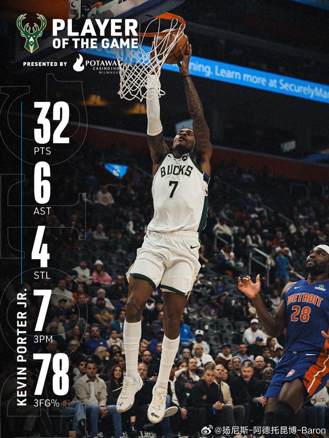 雄鹿112-124活塞,波特32分6助4断,坎宁安23分6板12助字母哥去哪儿