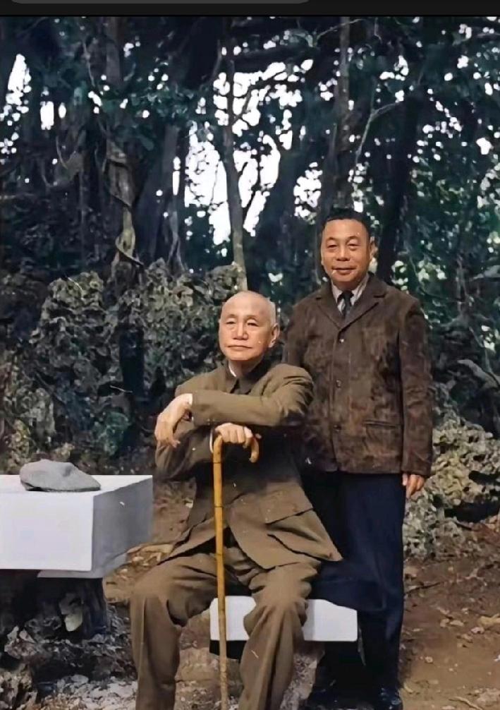 这是蒋介石和儿子蒋经国合影照片。 蒋介石拄着拐杖坐在一块长方形的石凳上,全身疲惫,一脸沮丧。此时他的心情像后面缠绕着大树枝上的藤蔓,纵横交错,头绪不清,两眼迷茫。 旁边的蒋经国紧靠父亲,强颜欢笑。
