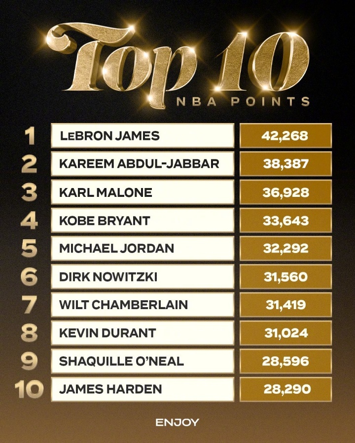 哈登历史得分榜第十位在比赛第三节,哈登两罚全中拿到本场第21分,生涯总得分正式超越了安东尼(28289),跻身NBA历史得分榜第十。