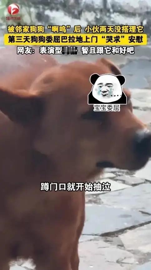 笑不活了!近日,云南昆明,一男子逗邻居家狗玩时,狗狗差点咬到他,男子一生气,2天都没有理狗,没想到,到了第3天,狗狗竟然站在门口哭了起来!男子见状瞬间不忍心,跑过来安慰了狗狗。网友:快点和它和好! 谁能想到,一只狗狗还会因为被“冷战”而委屈哭!这只狗狗叫旺财,是邻居家养了3年的中华田园犬,平时和男子亲得像一家人——男子下班回家,它总会摇着尾巴在单元楼门口等;男子手里拎着零食,它就乖乖蹲在脚边,眼神巴巴地望着,从不扑抢。可就因为一次意外的“小冲突”,这对“忘年交”闹起了别扭。 那天周末,男子闲着没事,在楼下逗旺财玩。他拿着树枝假装要打它,旺财以为是在闹着玩,兴奋地扑过来,张嘴时没掌握好力度,牙齿轻轻刮到了男子的手背,虽然没破皮,但也吓了男子一跳。“你这狗怎么回事!还真咬啊?”男子瞬间没了兴致,甩开手就回了家,临走时还瞪了旺财一眼。 旺财愣在原地,尾巴耷拉下来,刚才的兴奋劲一下子没了。它跟着男子跑到单元楼门口,扒着门缝往里瞅,可男子头也没回地关上了门。从那天起,男子就真的不再理旺财了——早上出门看到它蹲在门口,假装没看见径直走过;晚上下班旺财摇着尾巴凑过来,他也绕着道走;甚至旺财趴在他家门口哼哼,他也只是隔着门喊一句“走开”。 这两天,旺财像变了一只狗。以前总是蹦蹦跳跳的,现在却无精打采,蹲在自家门口,眼睛直勾勾地盯着男子家的方向,连平时最爱的骨头都没心思啃。邻居大姐看在眼里,笑着劝男子:“旺财就是个小狗,不懂事,你别跟它一般见识,它这两天都没好好吃东西呢。”可男子还在气头上:“它差点咬到我,不得让它长长记性!” 没想到,到了第三天早上,男子刚打开门,就看到旺财蹲在他家门口,低着头,肩膀一抽一抽的。走近了才发现,这小家伙竟然在哭!眼泪顺着眼角往下淌,湿漉漉地打湿了胸前的毛发,嘴里还发出“呜呜”的呜咽声,像个受了委屈的孩子,看到男子出来,也不敢上前,只是用湿漉漉的眼神望着他,尾巴轻轻扫着地面,满是讨好和愧疚。 男子瞬间就心软了。他看着旺财通红的眼睛,想起平时它黏着自己的样子,再想想自己这两天的冷遇,心里的火气一下子就烟消云散了。“哎呀,你这小家伙,还会哭啊!”他蹲下身,伸手摸了摸旺财的头,旺财立刻蹭了蹭他的手心,呜咽声变成了委屈的哼唧,眼泪流得更凶了,仿佛在诉说这两天的委屈。 男子一边给它擦眼泪,一边安慰:“好了好了,不生气了,以后不许随便扑人了啊。” 旺财像是听懂了,使劲点了点头,尾巴摇得越来越欢,还伸出舌头舔了舔男子的手背,像是在道歉。这一幕被邻居拍了下来发到网上,网友们瞬间被萌化了:“这狗狗也太通人性了吧!还知道委屈哭,太可爱了”“男子也太狠心了,让狗狗伤心了两天”“快点和好!这么懂事的狗狗,值得被好好对待”。 邻居大姐笑着说:“旺财平时最黏他了,这两天见不到他,饭都吃不下,晚上还趴在门口守着。” 男子也不好意思地笑了:“其实我第二天就不生气了,就是想逗逗它,没想到它这么较真,还哭了,早知道就不跟它冷战了。” 从那以后,男子又恢复了和旺财的“亲密互动”,每天下班都会给它带点零食,周末还会带着它去楼下散步。 其实,狗狗的情感远比我们想象的更纯粹、更细腻。它们懂得谁对自己好,也会因为被冷落而伤心,因为做错事而愧疚。旺财的眼泪,不是软弱,而是对男子的依赖和在乎。在它们的世界里,主人(或者像男子这样亲近的人)就是全部,被冷落的滋味,对它们来说无疑是一种折磨。 反观我们身边,有很多人养宠物,却常常忽略它们的情感需求。有的人为了一时兴起养宠物,新鲜感过后就弃之不顾;有的人觉得宠物只是动物,不需要太多陪伴和关心。但旺财的故事告诉我们,宠物也是有情绪、有感情的,它们需要被爱、被重视、被温柔对待。 这个看似搞笑的小故事,却藏着最温暖的情感。一只狗狗的委屈哭泣,让我们看到了动物的灵性和纯粹,也让我们反思自己对待宠物的态度。既然选择了养宠物,就应该对它们负责,不仅要满足它们的物质需求,更要关注它们的情感需求,用陪伴和爱,回应它们的依赖和忠诚。 愿每个宠物都能被温柔以待,愿每个主人都能珍惜这份纯粹的感情。毕竟,在宠物的世界里,你就是它的全世界。 各位读者你们怎么看?欢迎在评论区讨论。