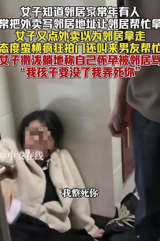 这事儿本质是自私无边界+道德绑架的闹剧,女子把邻居的善意当义务,还拿怀孕当“撒泼免罪符”,既失德又涉嫌违法。 女子长期故意填邻居地址点外卖,把别人家当“免费代收点”,不仅不感恩,还因自己没看手机(外卖实际在丰巢),就疯狂拍门半小时、冤枉邻居藏外卖,叫来男友撑腰施压。理亏后又躺地撒泼,拿“怀孕”威胁“孩子没了就整死你”,完全无视邻里边界和他人权益。 从法律上看,她的行为早已越界:一是冒用邻居地址,侵犯他人个人信息权和生活安宁权,违反《民法典》;二是恶意拍门、辱骂威胁,若扰乱公共秩序,可能违反《治安管理处罚法》面临警告或罚款;三是向平台提供虚假地址,还可能构成违约,需自行承担外卖丢失风险 。而“怀孕”从来不是违法撒泼的借口,真有意外也需举证邻居存在过错,而非随口威胁。 邻里相处的核心是“分寸”,帮代收是情分不是本分,消耗他人善意还倒打一耙,最终只会丢了自己的脸面。需要我整理一份“遇到他人冒用地址/恶意骚扰”的维权步骤清单,帮你快速应对类似情况吗?莫把道德绑架人 无道德行为 寻衅之事罪 素材取于网络,侵权删除。