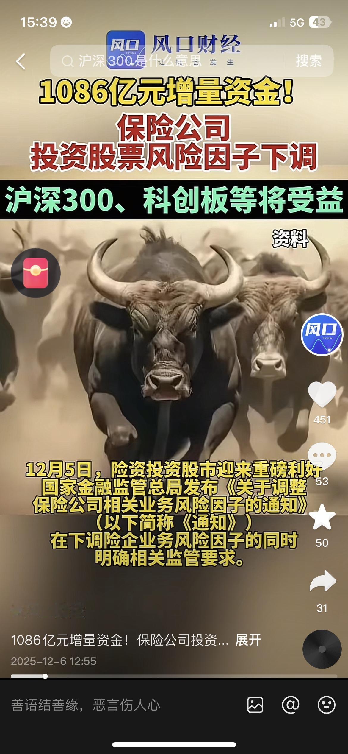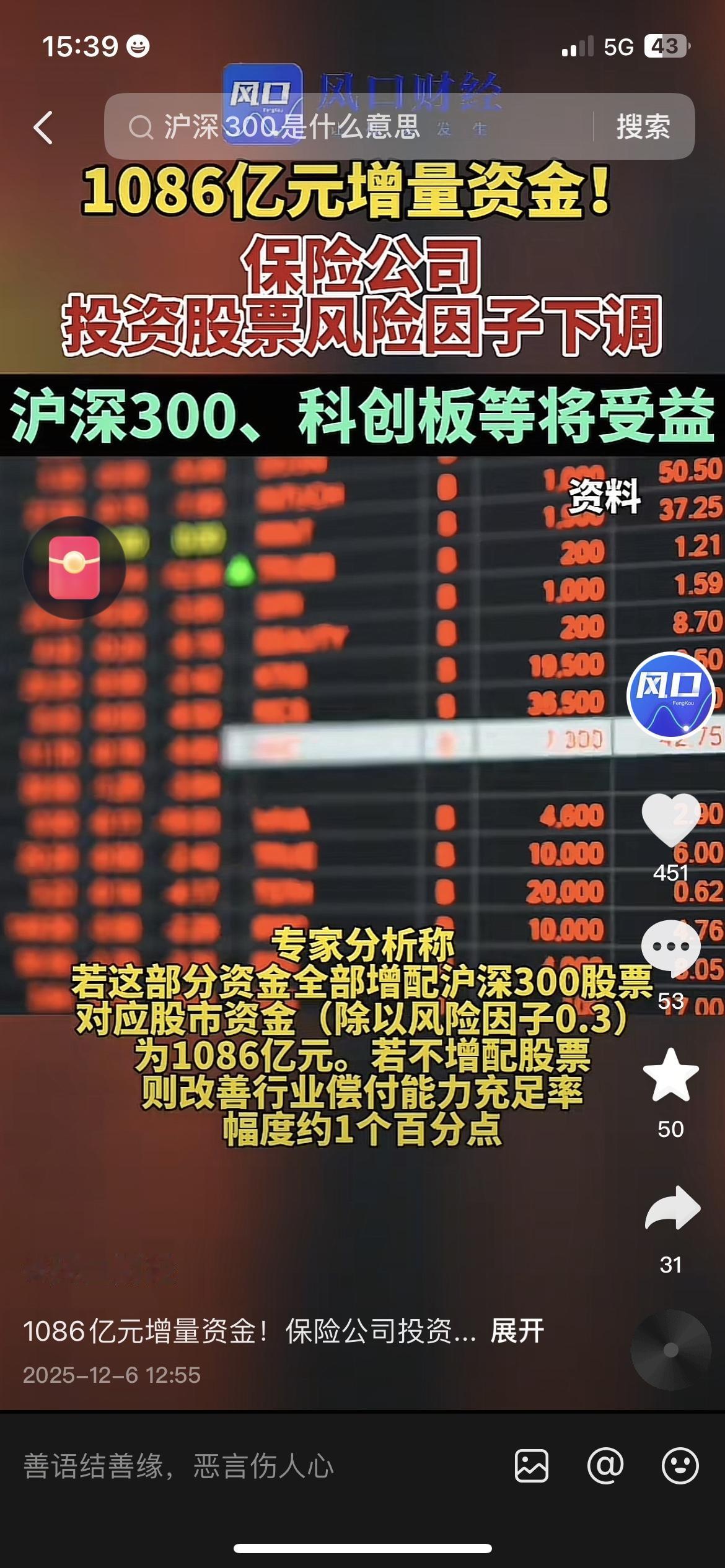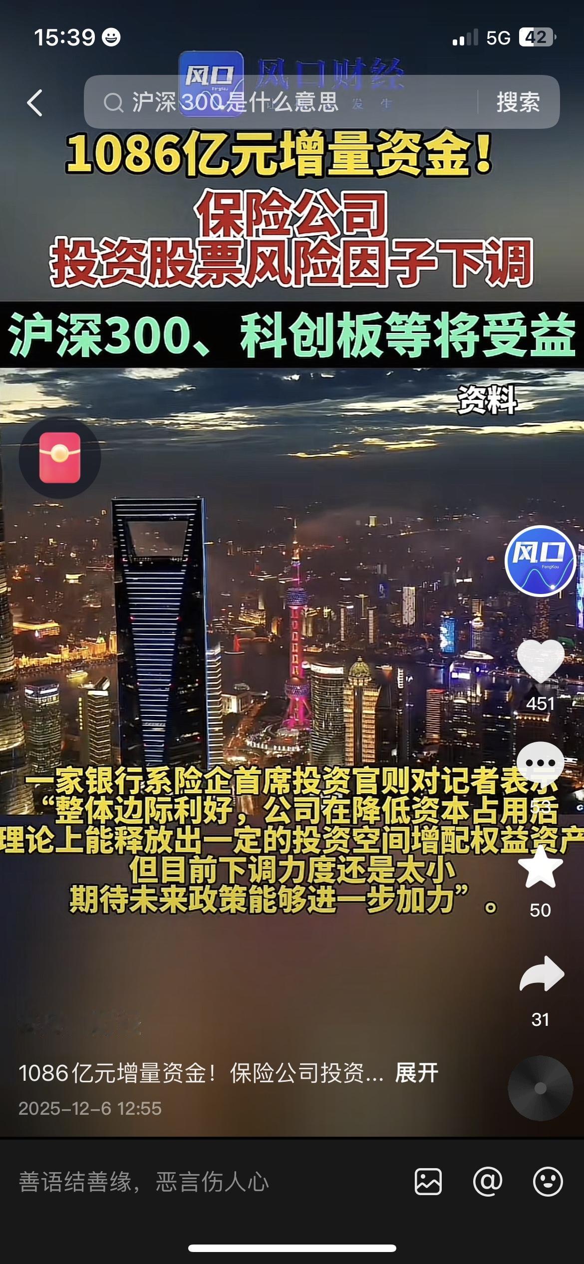 🔥险资入市再迎利好!千亿增量资金将进场,这些板块或优先受益 险资入市 A股市场动态 国家金融监管总局最新发文,下调险资投资股票类资产的风险因子,按当前险资规模测算,能释放超1086亿增量资金入市。业内专家分析,险资偏好稳健优质资产,沪深300成分股、科创板优质企业,还有消费、医药等低波动板块大概率会优先承接资金。 不过也有险企内部人士表示,这次风险因子下调力度不算大,对市场的短期拉动可能有限,后续若有配套政策落地,助力会更明显。 你觉得这波千亿资金能给A股提提劲吗?更看好哪个板块?