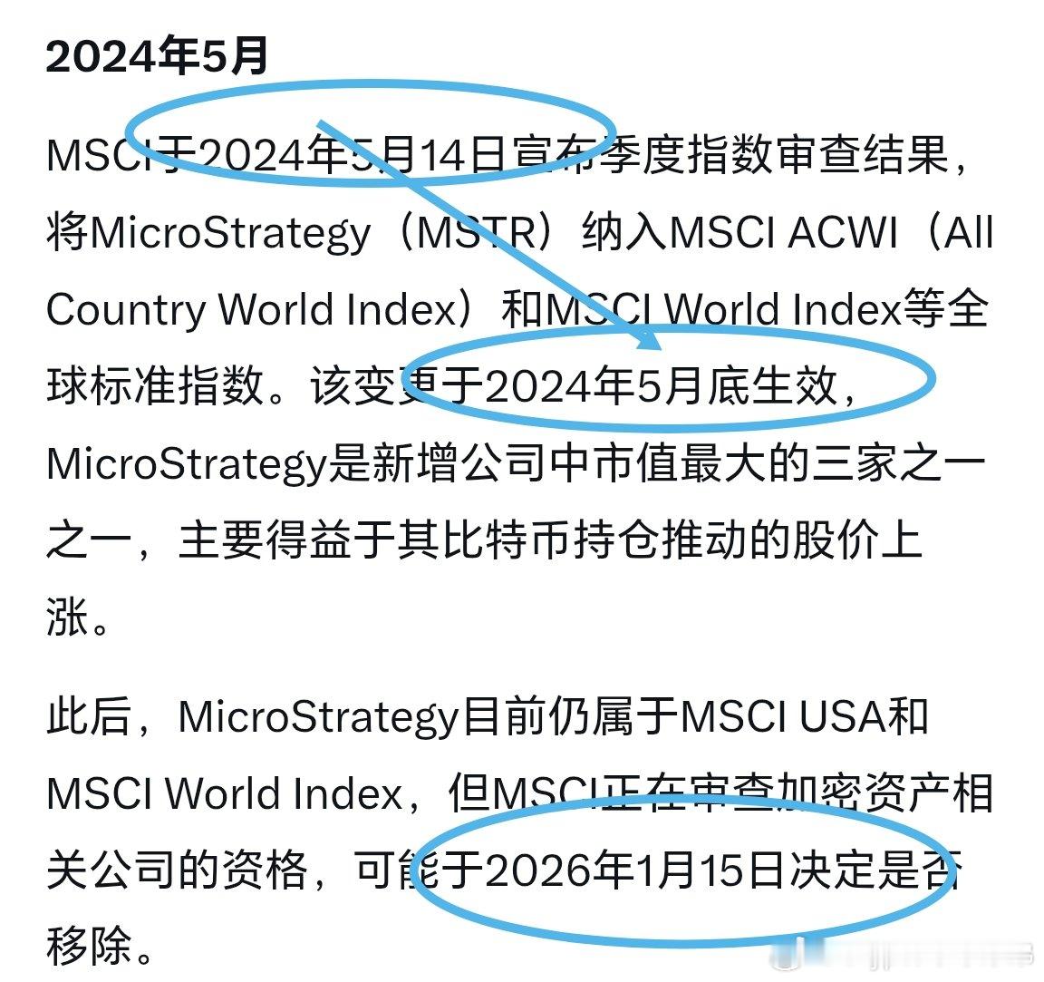 重要事件节点:微策略 $MSTR 2024.5.14宣布被纳入MSCI指标到5月底生效这段时间,包括宣布前和生效后一小段时间,比特币整体是涨📈势,2026.1.15可能决定是否移除,移除为坏消息,一定会触发卖盘,预计1.15前会有卖压避险;若不移除分两种:1.15前跌比较多,不移除有情绪修复,跌的少不移除为中性消息