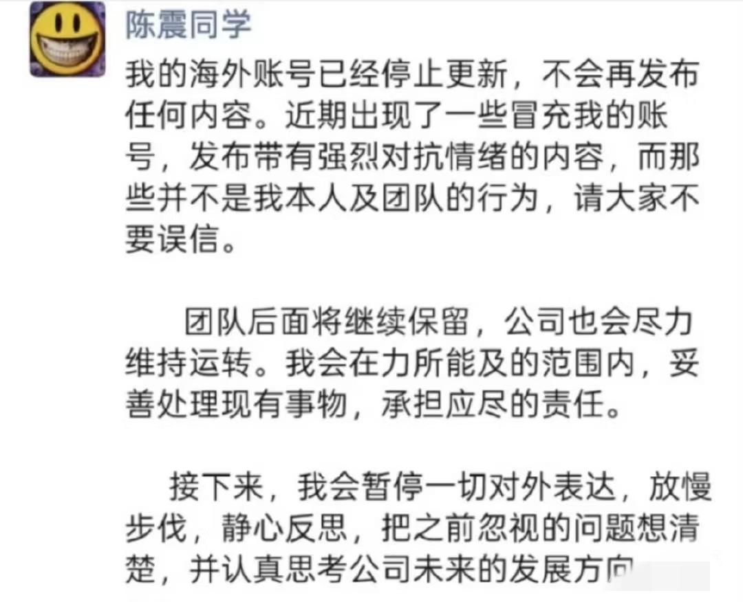 陈震同学最终朋友圈:静心反思。 陈震同学辟谣了,他的海外账号没有更新,有人冒充他,发布不实信息,希望大家不要被误导。 个人觉得,人犯错正常,陈震同学犯错了,该怎么处罚就怎么处罚,但不能一棍子将他打死,还是要给他一个改过自新的机会。