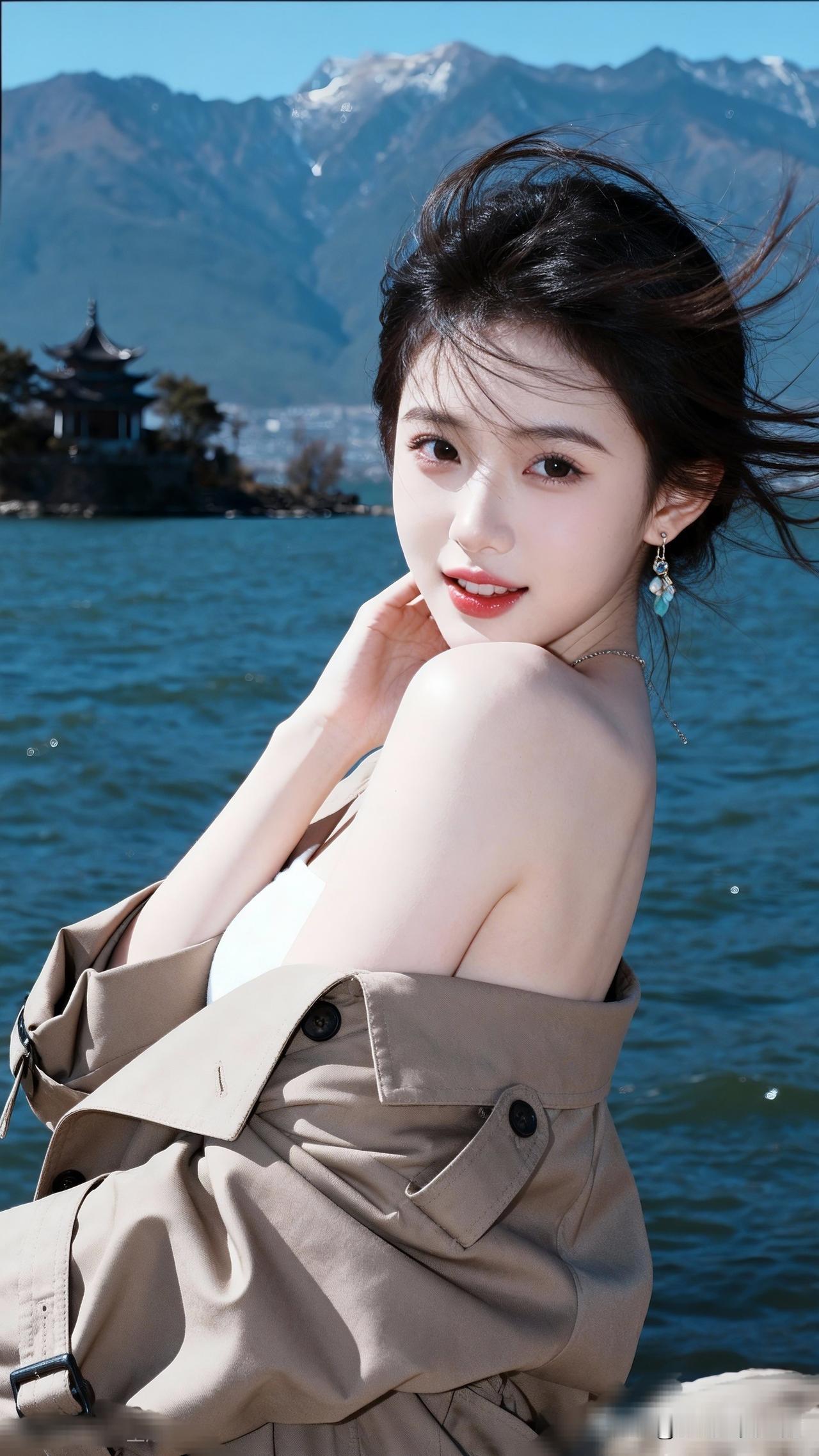 风起云涌处,美人倚湖畔。甜美小仙女的穿搭 少女在湖边,微风拂面,笑靥如花