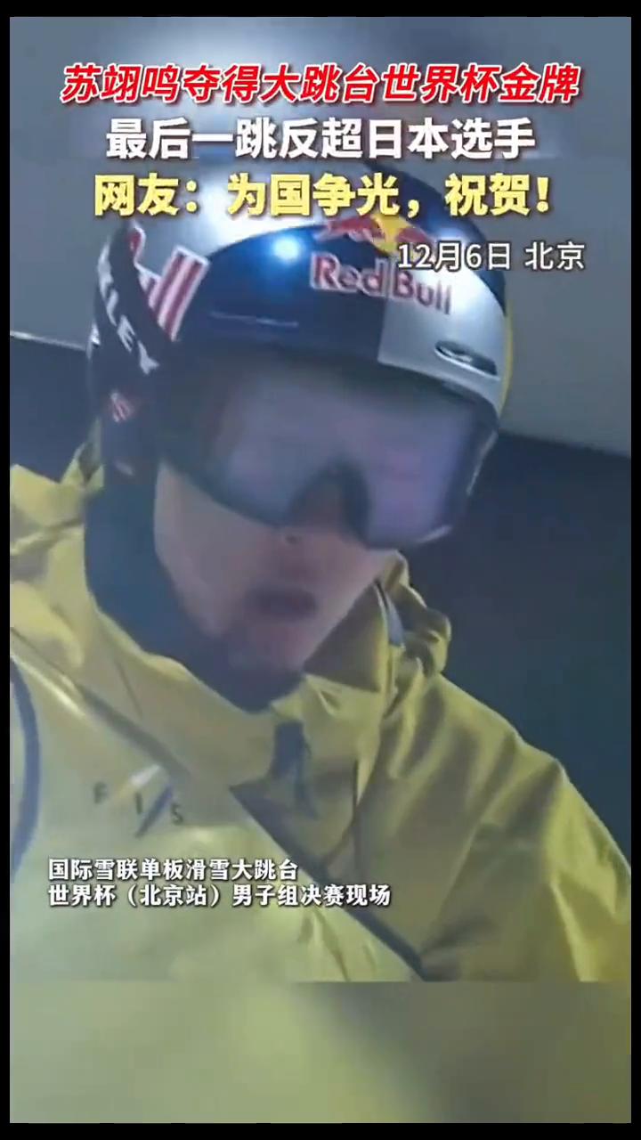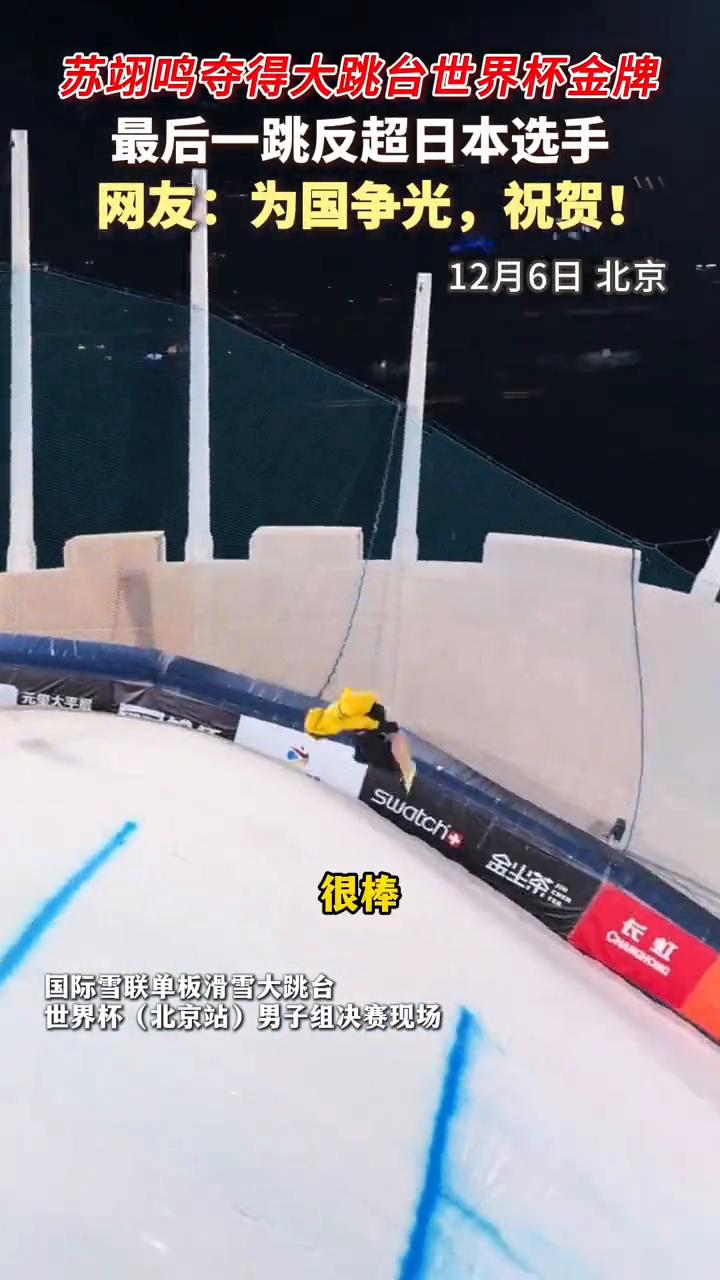 苏翊鸣夺得大跳台世界杯金牌,最后一跳反超日本选手。 网友:为国争光,祝贺!12月6日北京国际雪联单板滑雪大跳台世界杯(北京站)男子组决赛现场。 深呼吸,加油,很棒,稳稳的落地。这给现在排在第一的日本选手,热爱的事情都要不留遗力。只需要89.25分,苏翊鸣就可以在家门口从日本选手那里获得大跳台金牌。