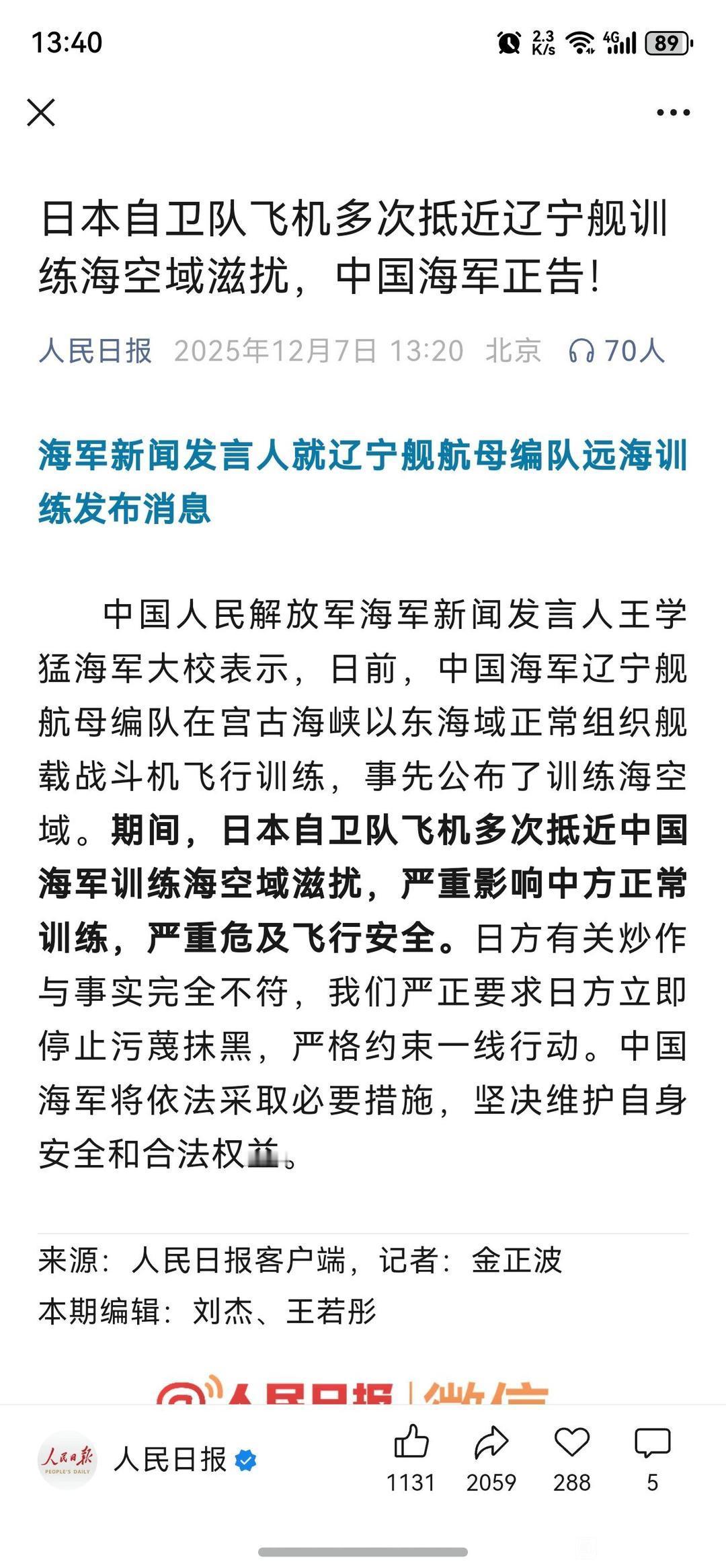 日机滋扰辽宁舰,日方炒作遭痛批! 日防卫大臣连夜抗议歼15用雷达照射日本战机,我方海军发言人回应:日本自卫队飞机多次滋扰辽宁舰编队训练,日方有关炒作与事实完全不符。 火药味是越来越浓了,说不定真会开战[石化][石化] 还是别打仗得好,战争太残酷了歼-15舰载机 日本战机 日本
