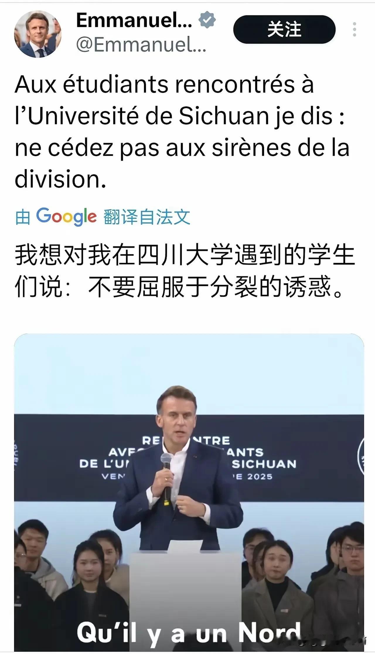 马克龙icon离开中国后发的推文:“我想对我在四川大学icon遇到的学生们说:不要屈服于分裂的诱惑!” 评几句 这是典型的马克龙式“柔性楔子”——表面送团结,实则埋议题;听起来像老师赠言,翻译过来就是“别急着拥抱你们官方给的叙事,要听欧洲讲另一种普世价值”。听其言观其行可以,若真把它当青春寄语,那就太给他加戏了。法国马克龙