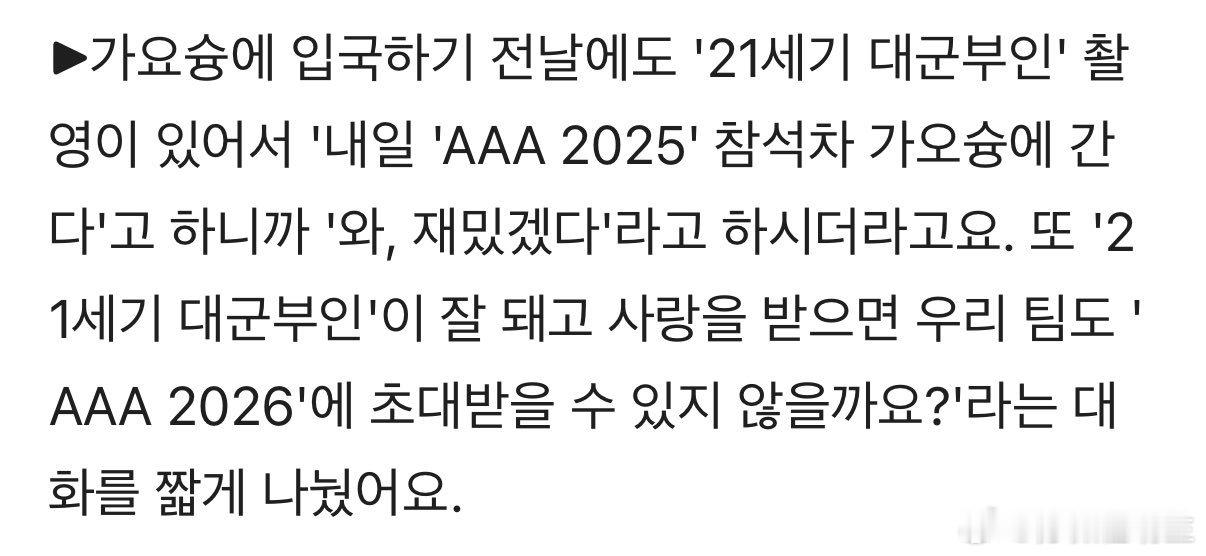 IU采访中提到边佑锡的部分🫶在去高雄的前一天还有《21世纪大君夫人》的拍摄,所以我说『明天我要去高雄参加AAA 2025』,边佑锡说“哇那应该很有意思”。还简短地聊了聊说“如果《21世纪大君夫人》反响很好很受欢迎的话,我们团队是不是也能受邀参加AAA 2026了呢?”这样的话。
