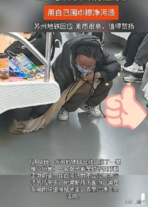 素质好的人无论在什么样的环境之下,他们展现出来的都是令人刮目相看的一面,苏州地铁的一幕,温暖了无数人的心。 12月3日中午,苏州地铁11号线的车厢里,一杯打翻的奶茶,让所有人看见了“刻在骨子里的素质”。 视频里的姑娘刚坐下,奶茶就“啪”地洒了一地——褐色的液体溅在地板上,连座位缝隙都沾了黏糊糊的珍珠。 她没慌着躲,也没等保洁,先掏出随身带的纸巾蹲下来擦。可一小包纸巾根本不够用,眼看污渍越蹭越黏,她直接解下脖子上的浅色围巾,裹住污渍反复按压,连缝隙里的珍珠都一颗颗捡干净。 等她擦完起身,围巾已经染成了奶茶色,她却只是把脏围巾折好,默默下了车。 这一幕被乘客拍下来,全网都破防了: “换作是我,最多用纸巾擦两下,剩下的等保洁。” “一条围巾几十块,奶茶才十几块,这姑娘‘亏’大了,但人品赚麻了。” “她蹲下去的那一刻,比任何奢侈品都体面。” 更暖的是,苏州地铁看完视频直接“全城寻人”:不光公开点赞“你擦奶茶的样子超美”,还备好了新围巾、文创礼包和食堂餐券,就等姑娘来认领。 有人说这是“小题大做”,可恰恰是这些“小题”,才是文明最真实的模样—— 你在地铁里外放视频时,有人默默调低音量; 你随手扔垃圾时,有人弯腰捡起塞进垃圾桶; 你打翻奶茶想溜走时,有人用围巾把“麻烦”擦得干干净净。 这些事没多伟大,只是“自己的错自己担”“别给别人添麻烦”的朴素念头。 而苏州地铁的回应,更让这份善意成了双向奔赴:他们没把姑娘捧成“道德模范”,只是用一份礼物告诉所有人——你的善良,会被看见,更会被珍惜。 现在姑娘还没联系地铁方,但她那条脏了的围巾,早成了这个冬天最暖的“文明勋章”。 毕竟,能擦净地面污渍的东西有很多,可擦得净人心冷漠的,只有这份藏在细节里的温柔。
