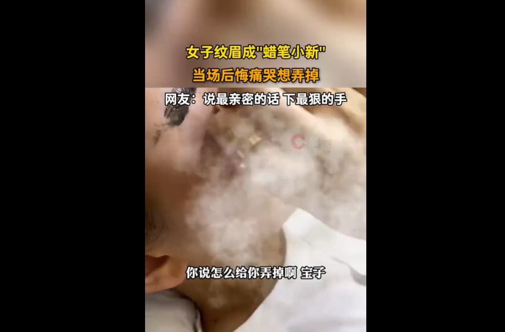 浙江一女子纹眉后效果过粗过黑像“蜡笔小新”,当场崩溃痛哭,视频引热议。 不少人