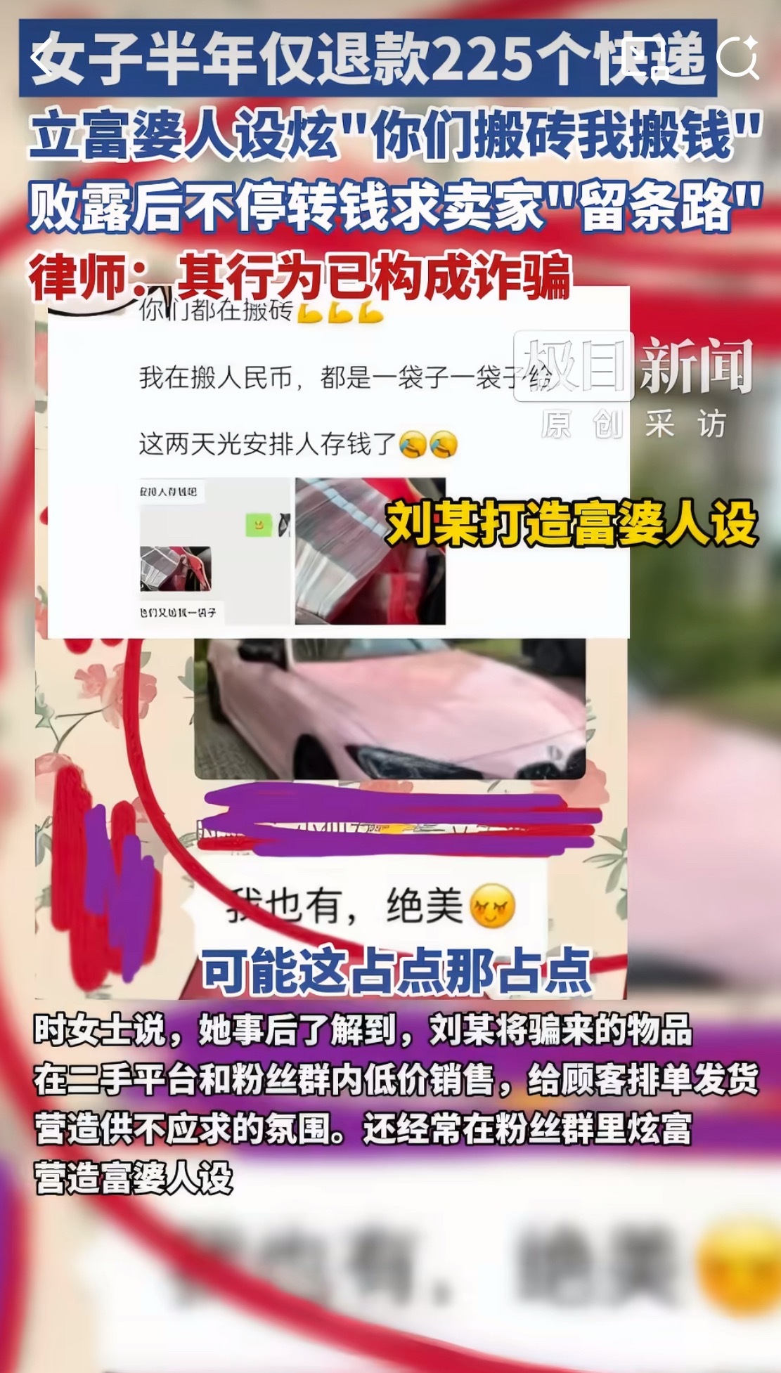 仅退款225个快递女子打造富婆人设这么大鼻子的粉宝马,看着像4系总结一下,一般能在朋友圈炫富的,都是想骗💰的,需格外小心